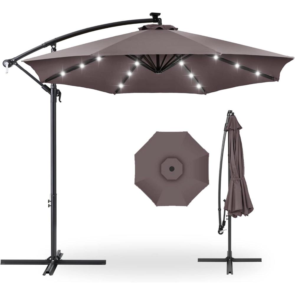 imageBest Choice Products 10ft Solar LED Offset Hanging Market Patio Umbrella for Backyard Poolside Lawn and Garden wEasy Tilt Adjustment Polyester Shade 8 Ribs  TanDeep Taupe