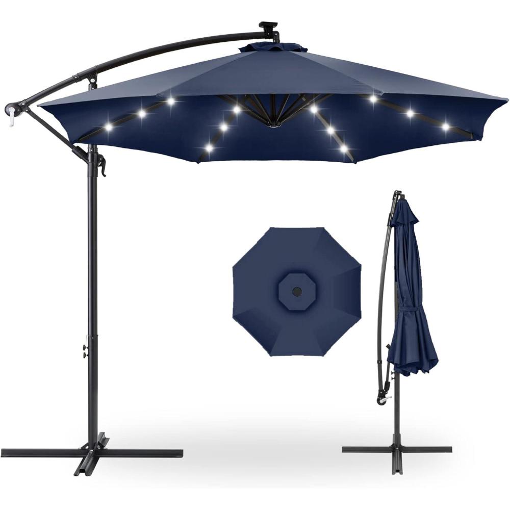 Best Choice Products 10ft Solar LED Offset Hanging Market Patio Umbrella for Backyard, Poolside, Lawn and Garden w/Easy Tilt Adjustment, Polyester Shade, 8 Ribs - Tan(Navy Blue)