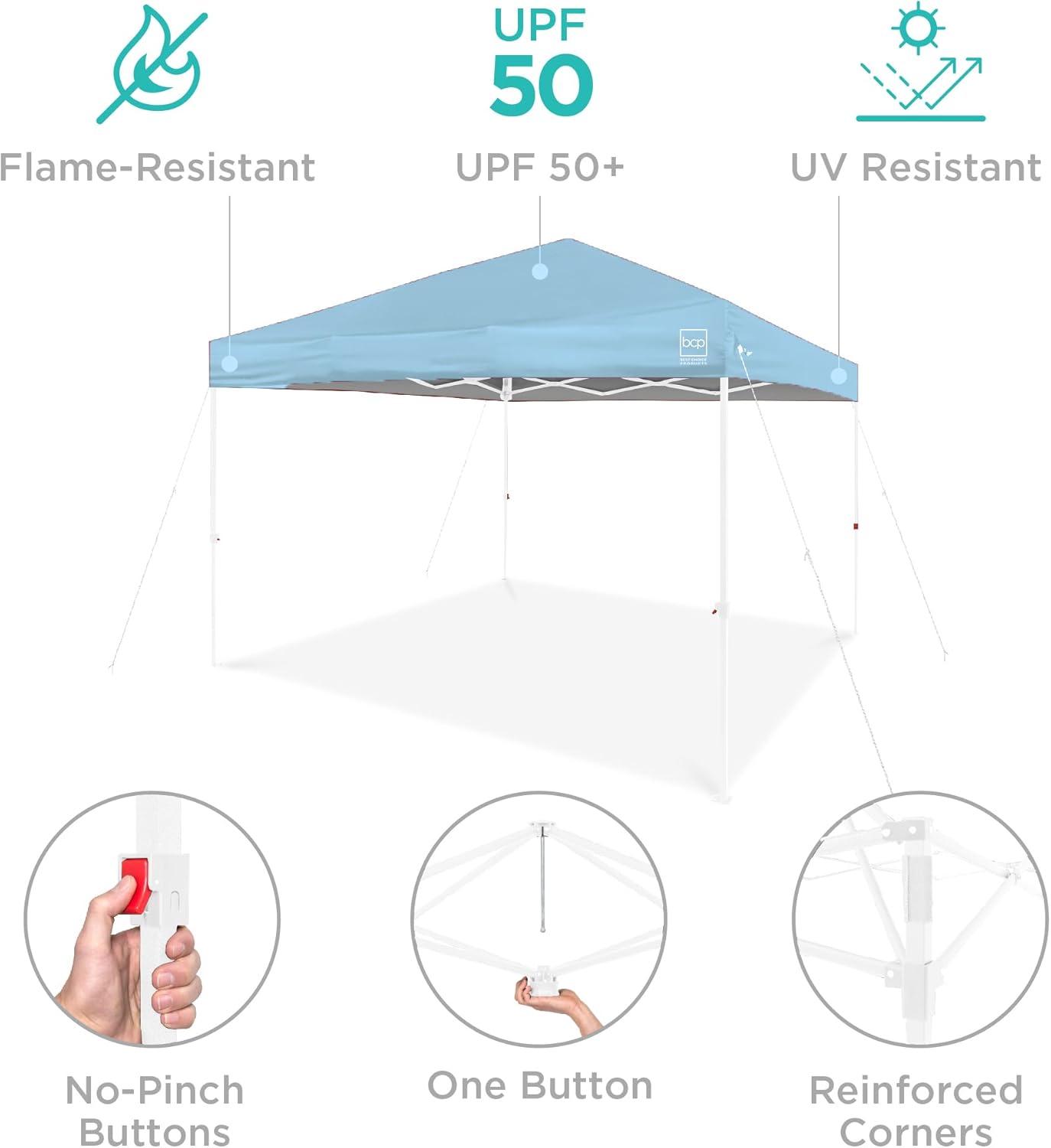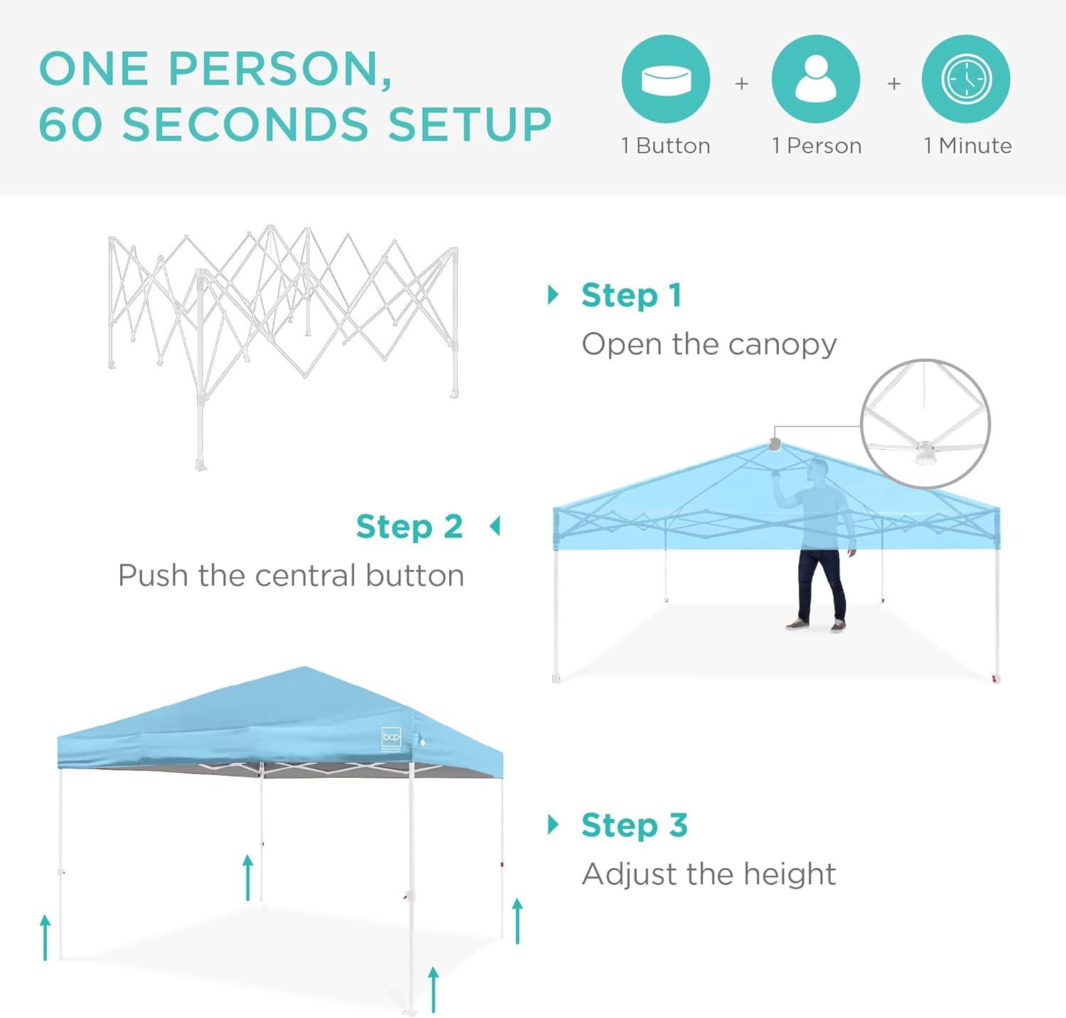 ONE-PERSON SETUP: Designed with one central button and no-pinch height adjusters to allow easy, one-person setup and breakdown; just open the canopy, push the button, and adjust the height for instant shade in only a minute!