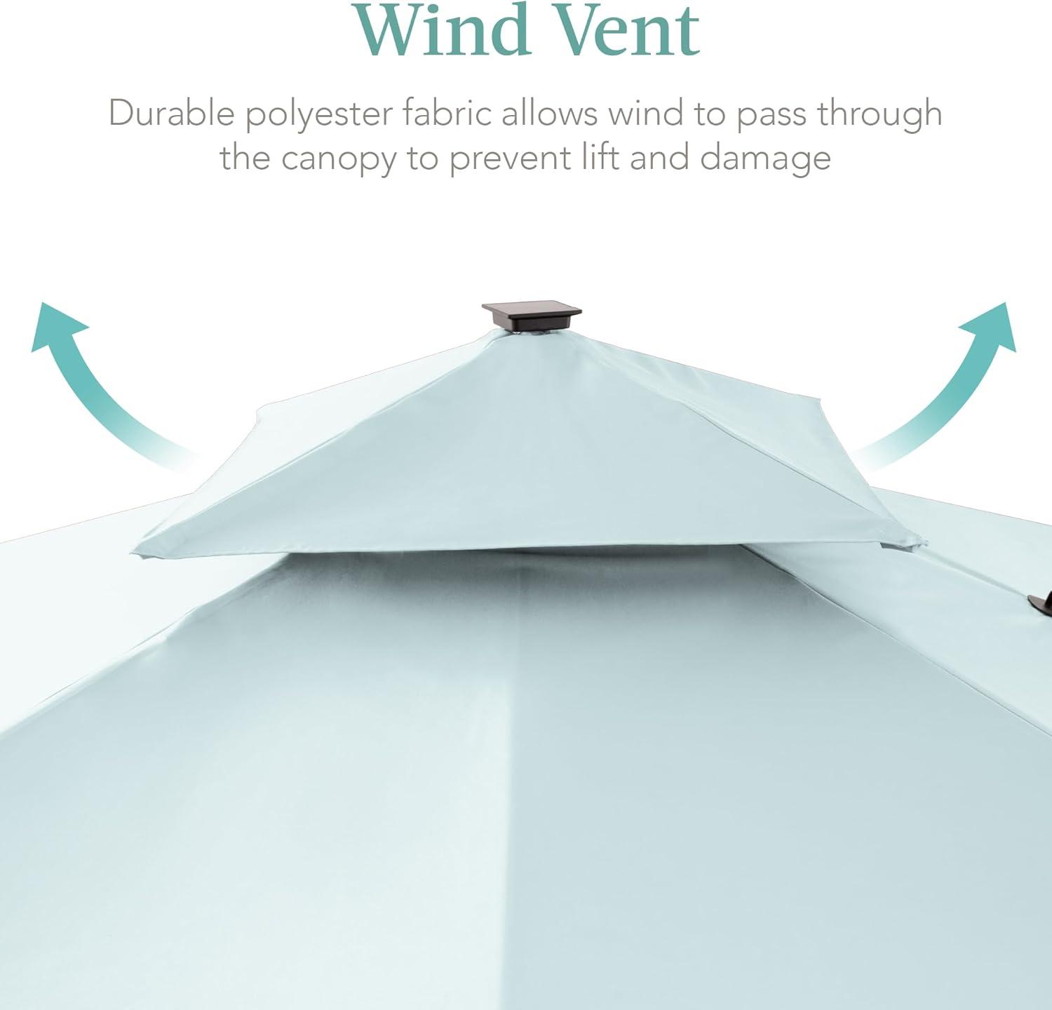 WIND VENT: Durable polyester fabric resists damage from the elements while the vent promotes airflow, cooling your guests while adding stability; OVERALL DIMENSIONS: 120″(L) x 120″(W) x 105″(H); Canopy cover included