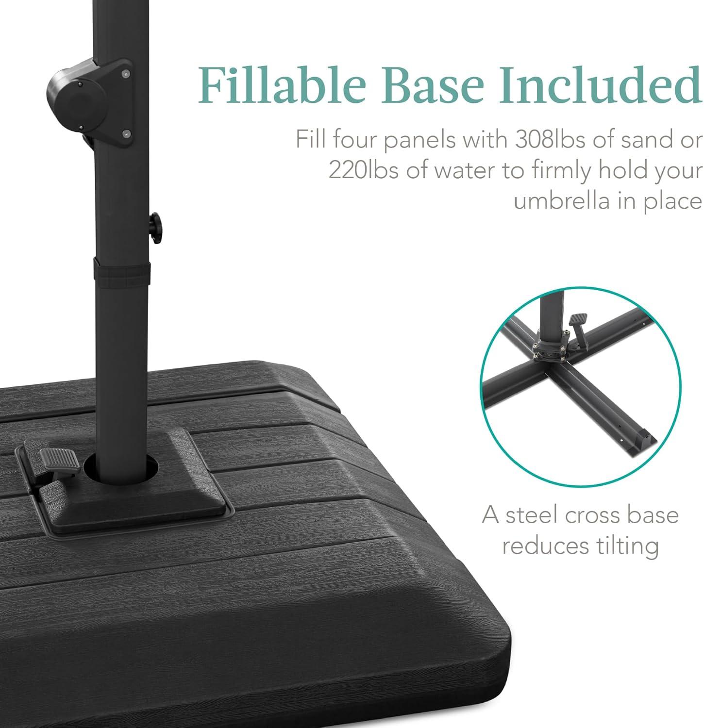 FILLABLE BASE: This 4-piece base comes with fillable reservoirs to hold your choice of sand (308 lbs.) or water (220 lbs.) and keep your umbrella in place