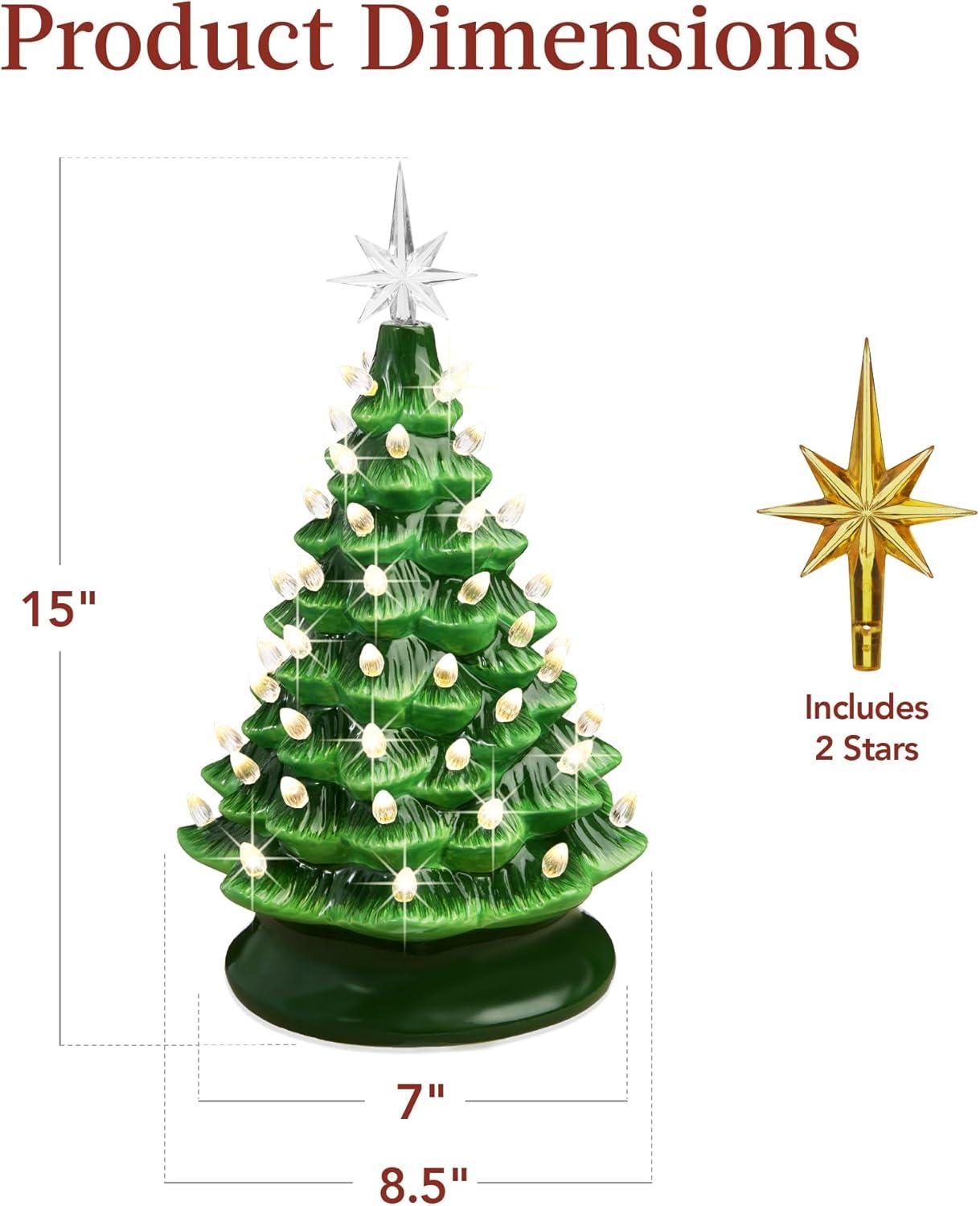 Best Choice Products 15in Ceramic Christmas Tree, Pre-lit Hand-Painted Tabletop Holiday Tree, 2 Star Toppers, 64 Lights – Peppermint w/Red and White Bulbs(Green W/ Multicolored Lights)