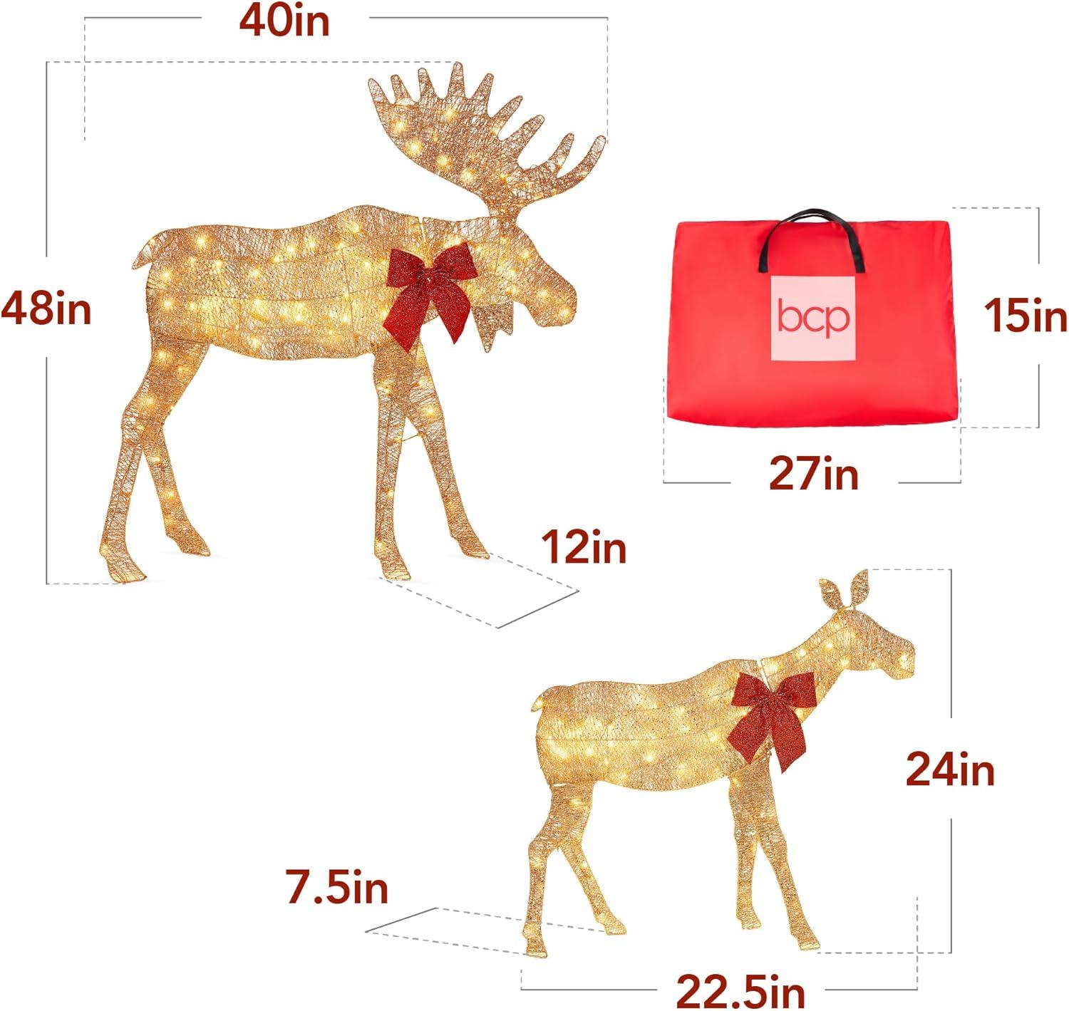 Best Choice Products 2D Moose Family Outdoor 2Pc Christmas Yard Décor, 4ft Lighted Yard Set Prelit All-Weather w/ 125 LEDs, Ground Stakes – Gold(Rattan – 2-Piece)
