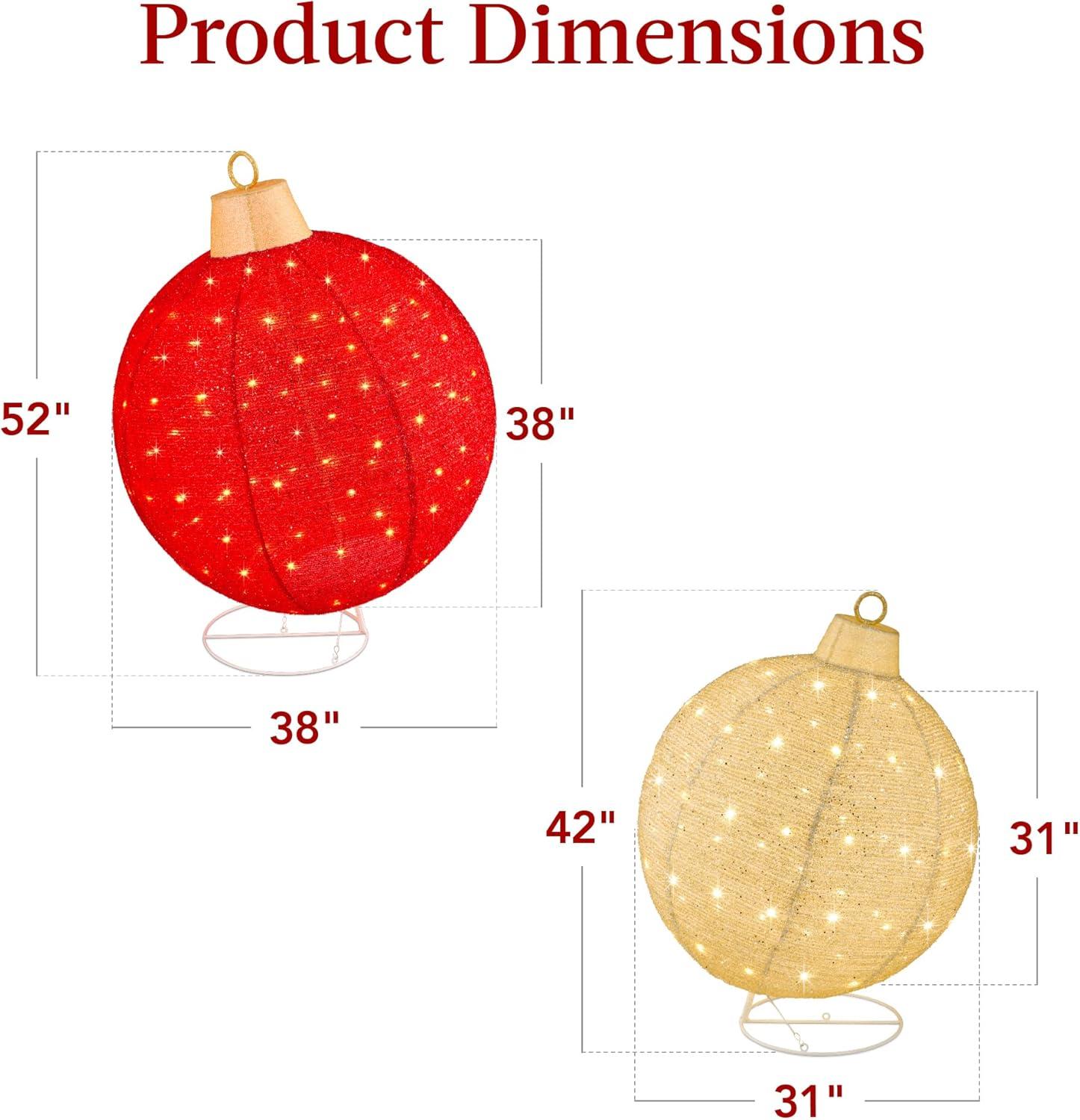 WEATHER-FRIENDLY: These ornaments are built with heavy wire frames and overlaid with rain-, snow-, and wind-resistant fabric to help maintain a vibrant appearance all season long; LARGE ORNAMENT DIMENSIONS: 38″(L) x 38″(W) x 52″(H); SMALL ORNAMENT DIMENSIONS: 31″(L) x 31″(W) x 42″(H)