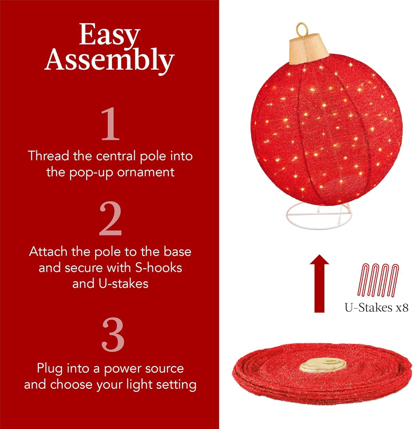 EASY ASSEMBLY: Light and collapsible for easy storage, these ornaments come together in up to 15 minutes and use a simple, 2-prong power cord to set the stage for an oversized holiday glow