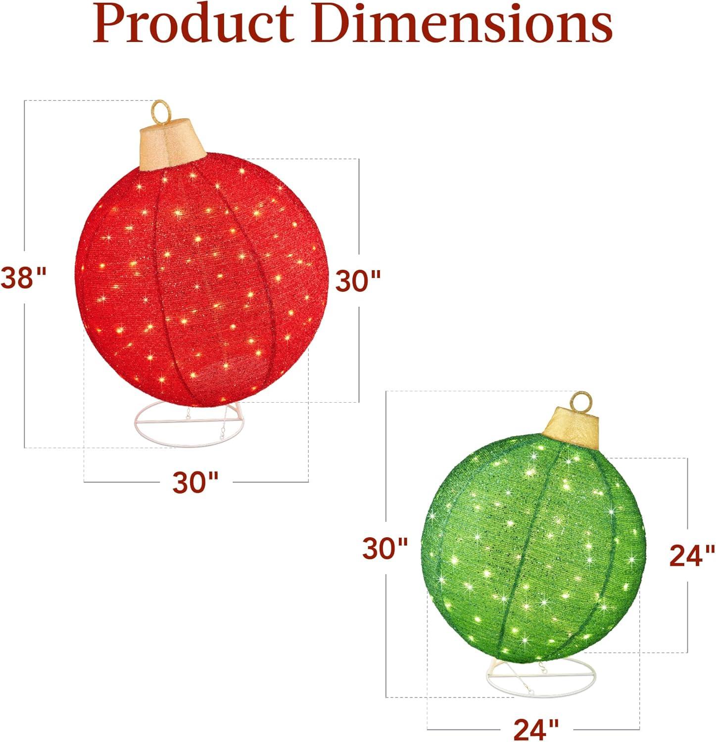 WEATHER-FRIENDLY: These ornaments are built with heavy wire frames and overlaid with rain-, snow-, and wind-resistant fabric to help maintain a vibrant appearance all season long; LARGE ORNAMENT DIMENSIONS: 38″(L) x 38″(W) x 52″(H); SMALL ORNAMENT DIMENSIONS: 31″(L) x 31″(W) x 42″(H)