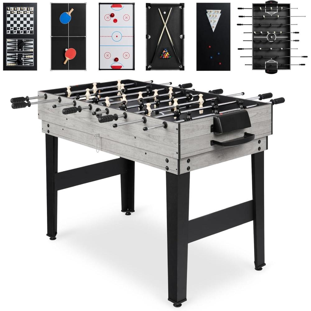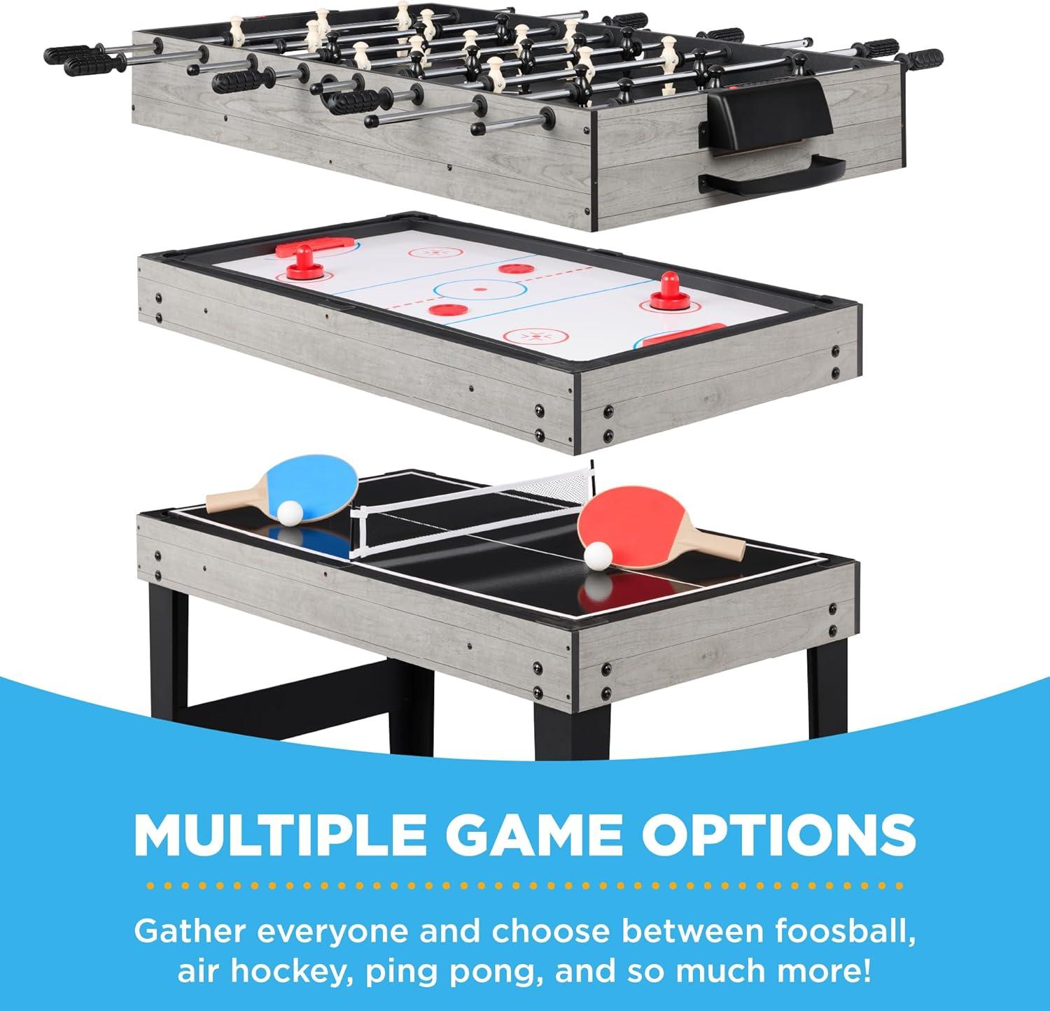 VERSATILE 10-IN-1 TABLE: Interchangeable table top lets you play slide hockey, foosball, billiards, shuffleboard, table tennis, chess, cards, checkers, bowling, and backgammon (Billiards and table tennis are not regulation size)