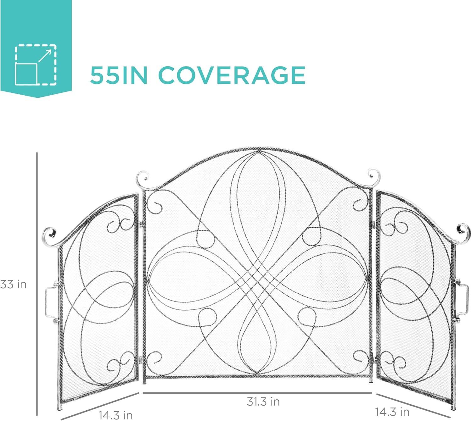 Best Choice Products 3-Panel 55x33in Solid Wrought Iron See-Through Metal Fireplace Screen, Spark Guard Safety Protector w/Decorative Scroll - Copper(Pewter)