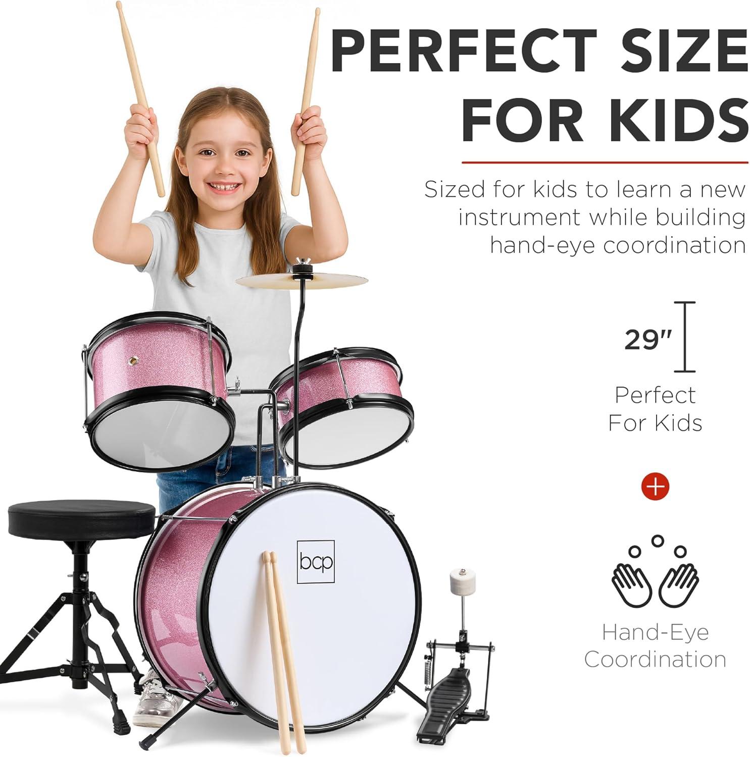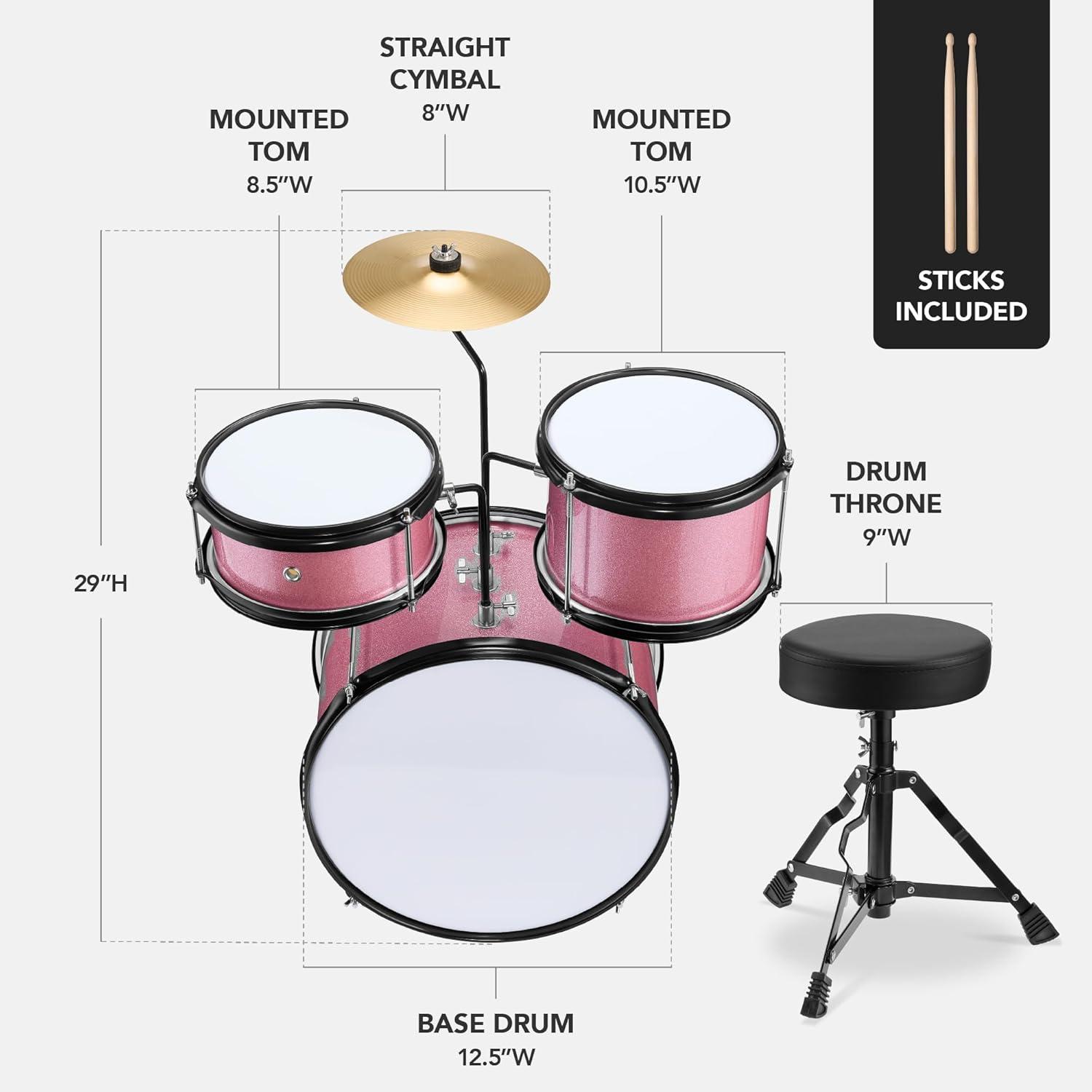 Best Choice Products 3-Piece Beginner Drum Set for Kids Juniors, w/Throne Stool, Cymbal, Drum Sticks, Bass Drum Pedal, 2 Toms – Blue(Pink Sparkle)