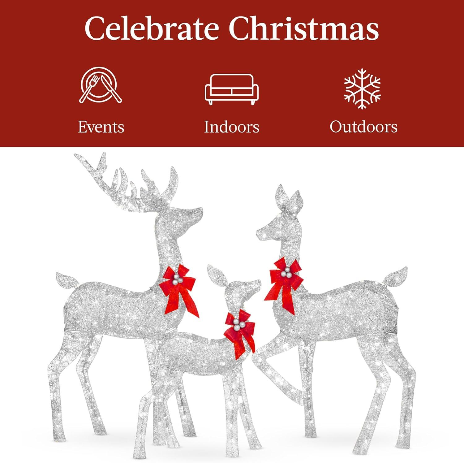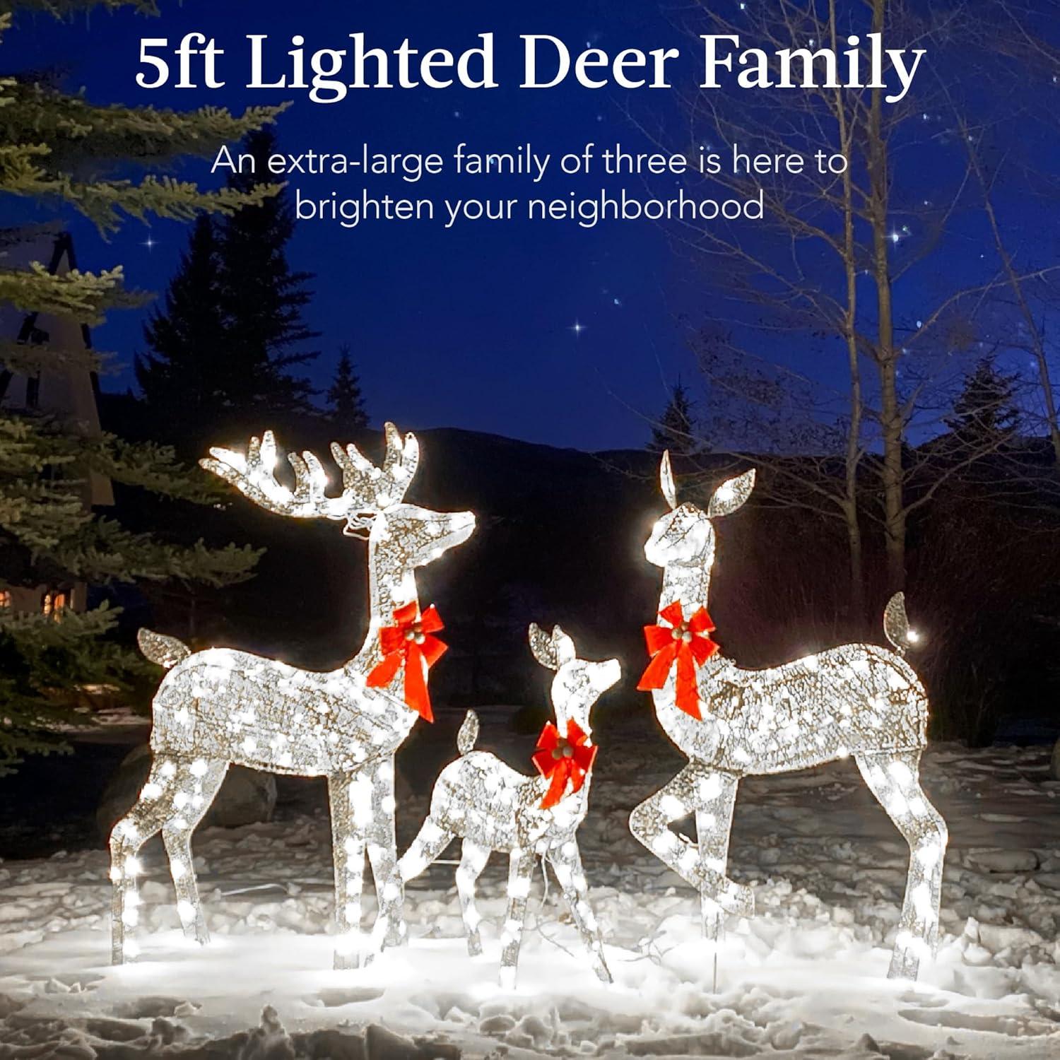 Best Choice Products 3-Piece Large Lighted Christmas Deer Family Set 5Ft Outdoor Yard Decoration with 360 LED Lights, Stakes, Zip Ties - Rattan(Silver - Large)