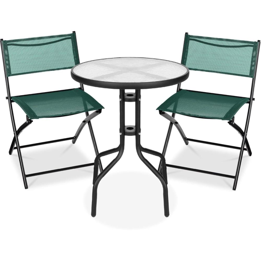 Best Choice Products 3-Piece Patio Bistro Dining Furniture Set w/Glass Tabletop, 2 Folding Chairs, Steel Frame, Polyester Fabric – Gray(Dark Green)