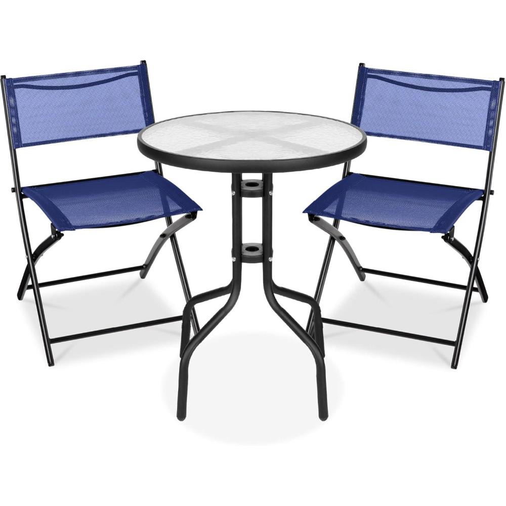 Best Choice Products 3-Piece Patio Bistro Dining Furniture Set w/Glass Tabletop, 2 Folding Chairs, Steel Frame, Polyester Fabric - Gray(Navy)