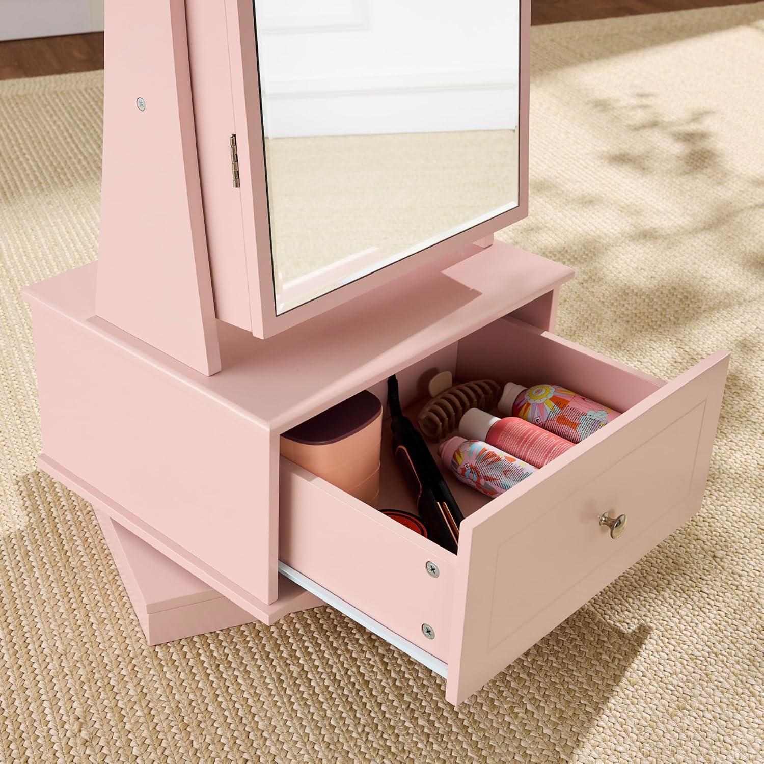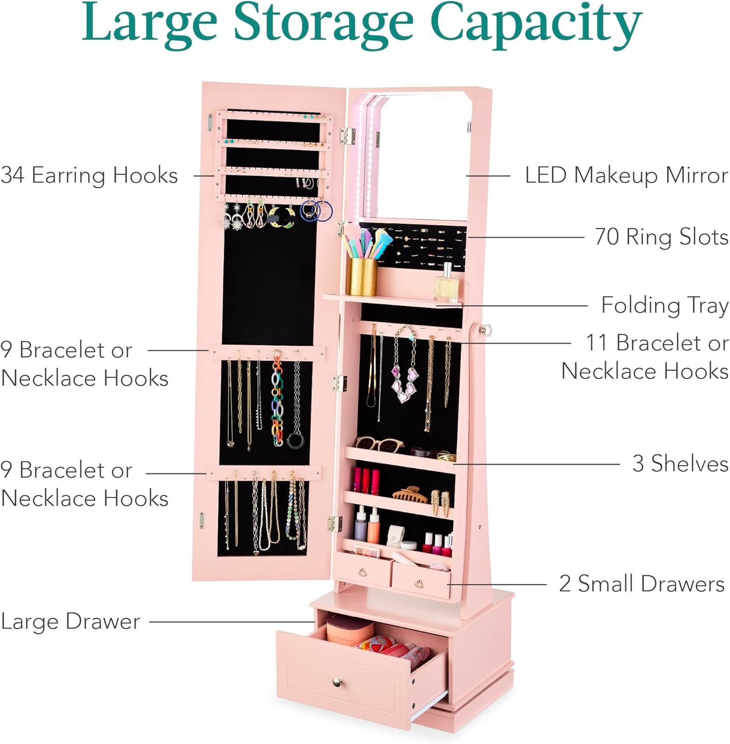 AMPLE STORAGE: Includes 29 hooks for bracelets and necklaces, 34 earring rests, 70 ring slots, three lined shelves for cosmetics, a foldable makeup shelf, two pull-out cubbies, and a large base drawer for cosmetics and accessories