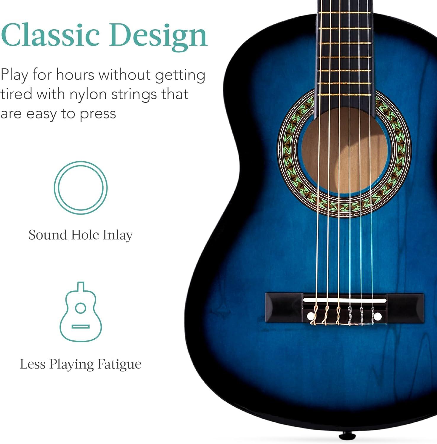 EASY TO PLAY: Learning to play on this guitar is easy with nylon strings that are easier to hold down, reduce damage on the guitar bridge, and stay in tune, producing a beautiful tone while playing; OVERALL DIMENSIONS: 38″(L) x 14″(W) x 4.3″(H)
