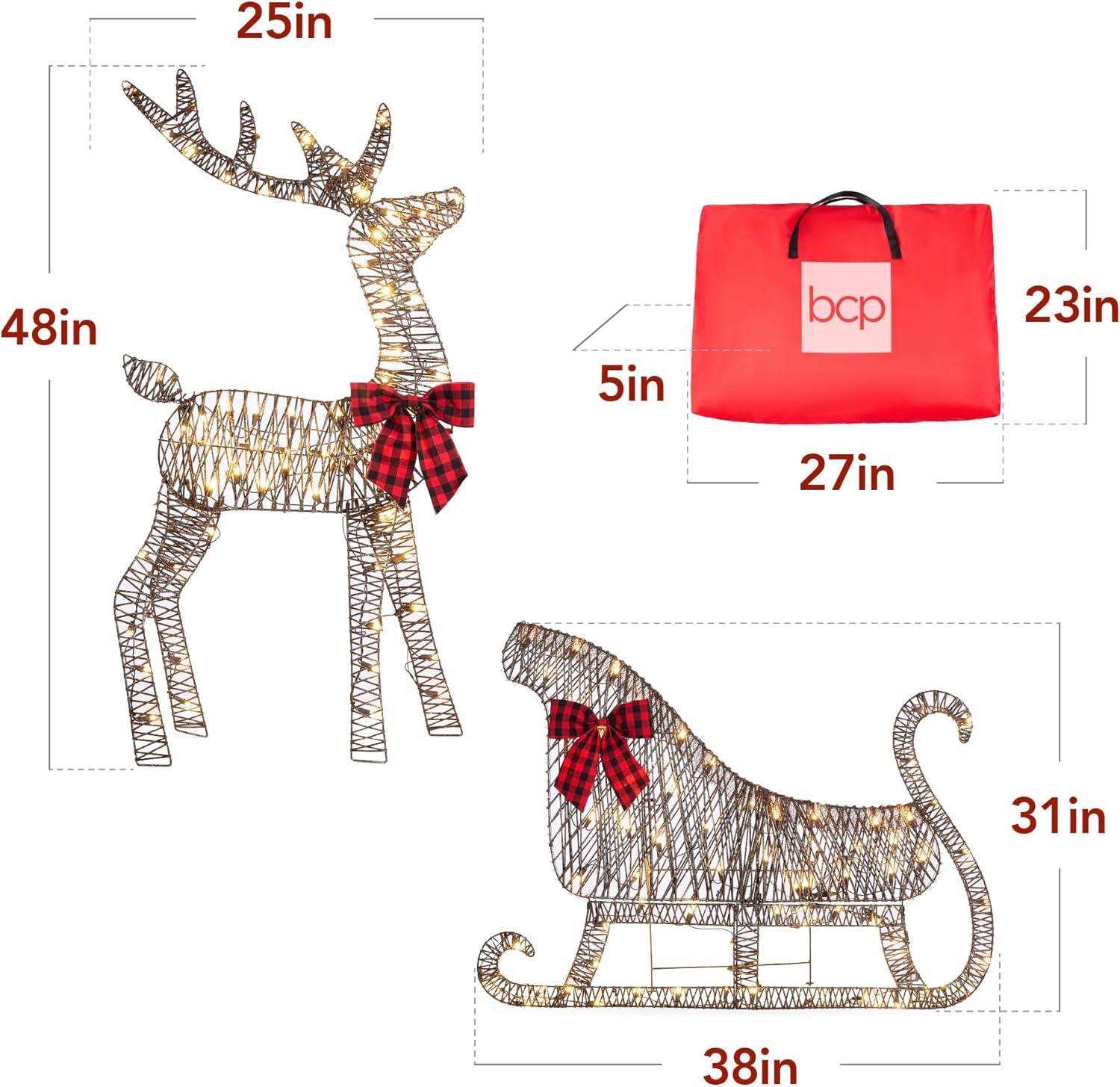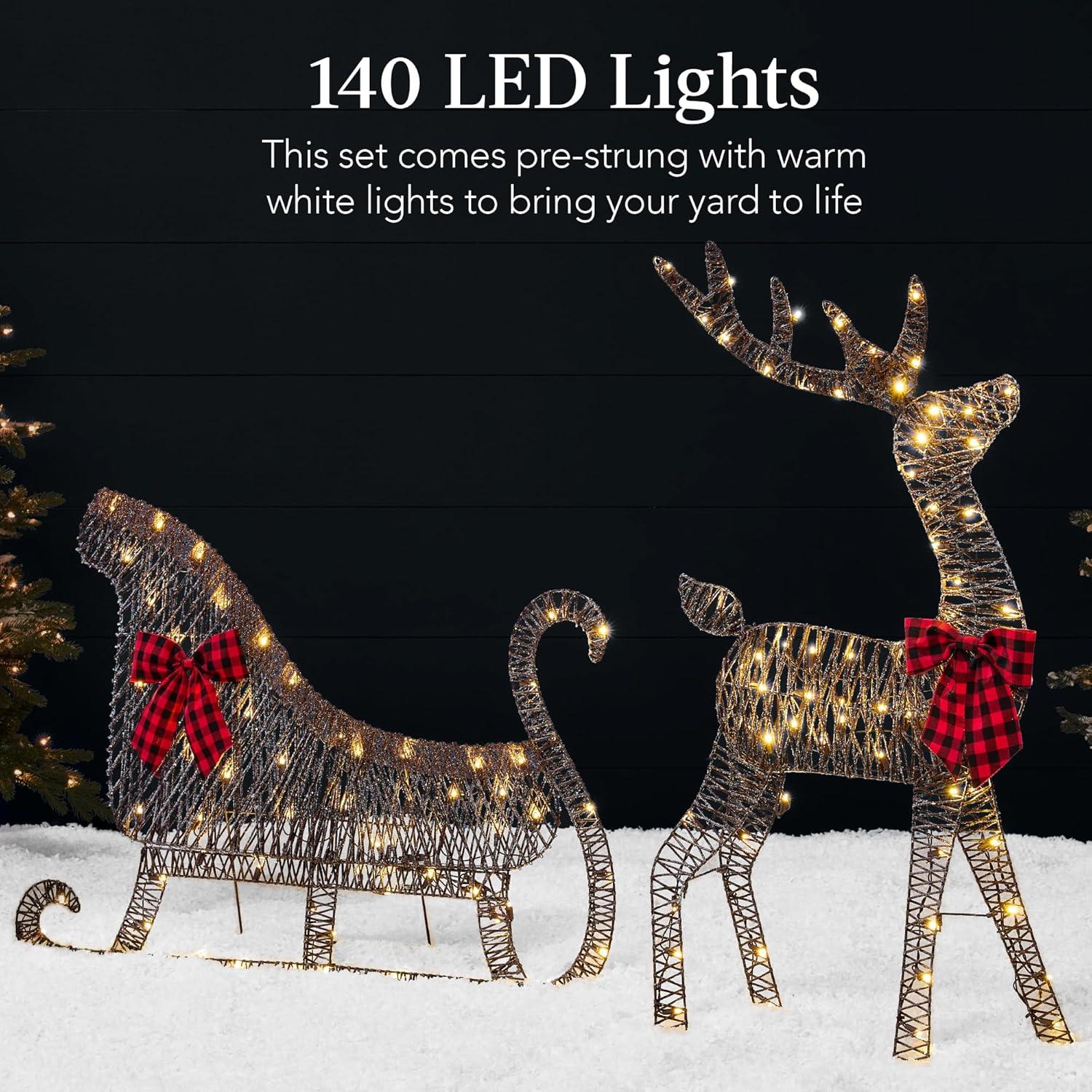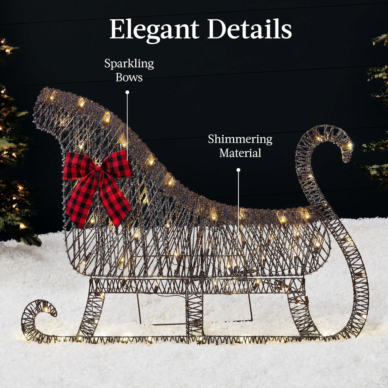 ELEGANT DETAILS: Durable metal frames are wrapped with shimmering holiday themed colors and accented with matching bows on both the reindeer and sleigh
