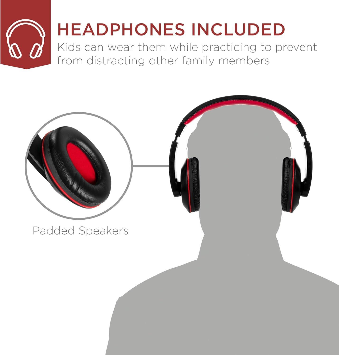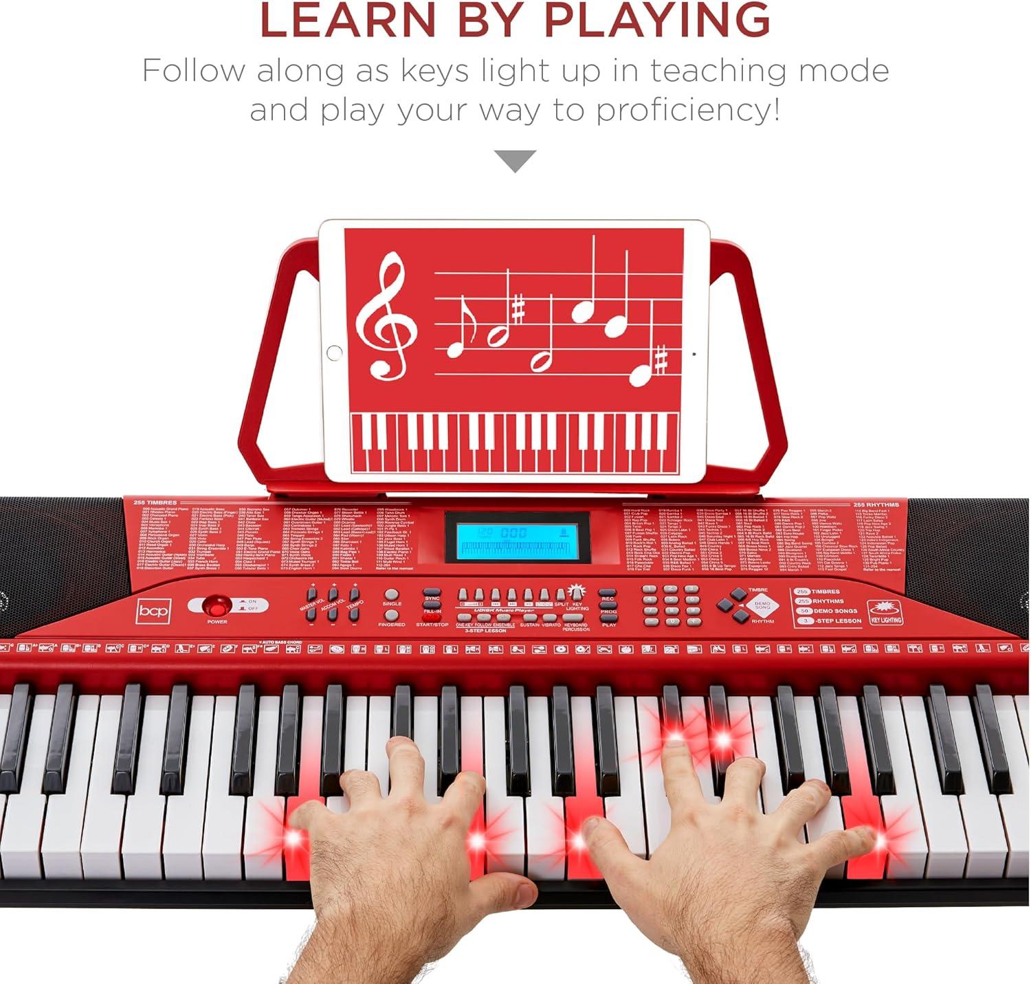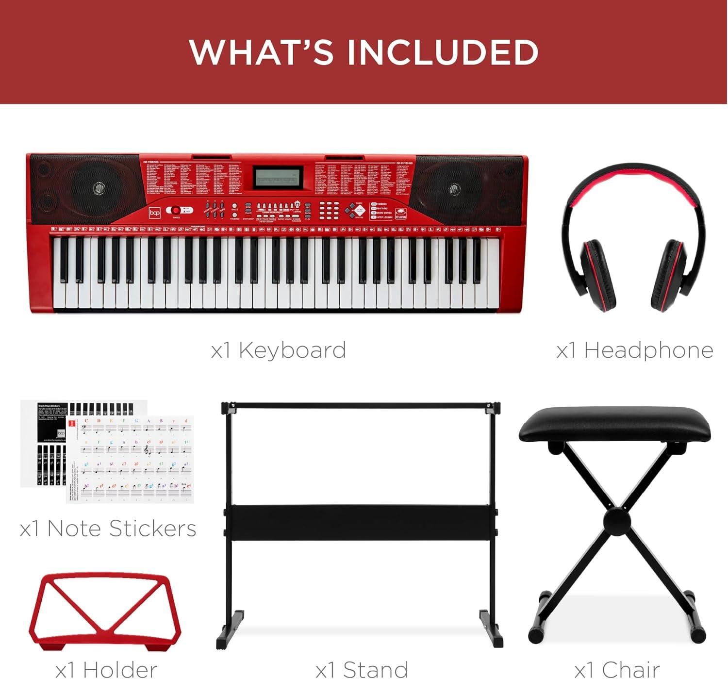 Best Choice Products 61-Key Beginners Complete Electronic Keyboard Piano Set w/Lighted Keys, LCD Screen, Headphones, Stand, Bench, Teaching Modes, Note Stickers, Built-In Speakers - Red(Red)