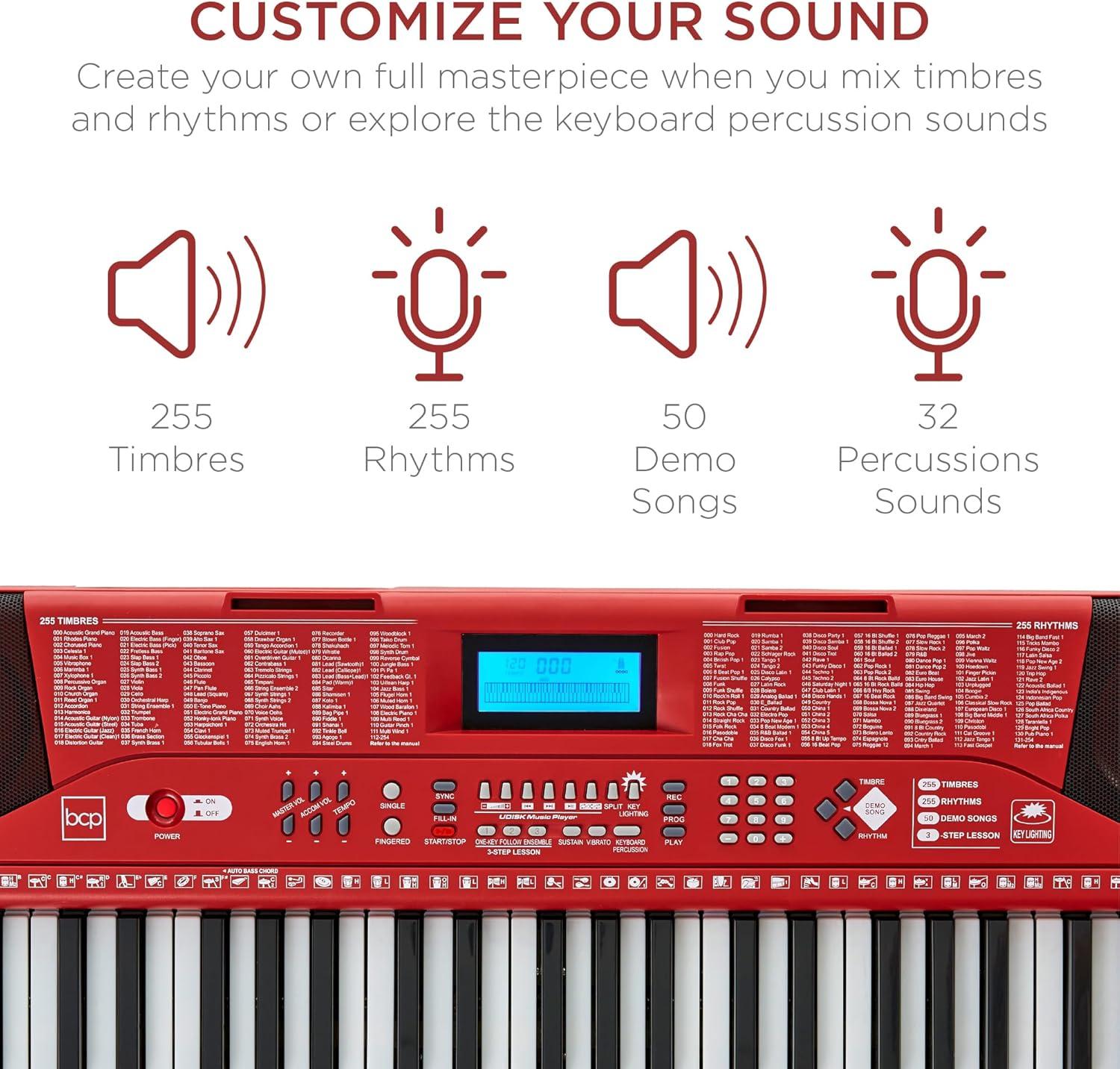 imageBest Choice Products 61Key Beginners Complete Electronic Keyboard Piano Set wLighted Keys LCD Screen Headphones Stand Bench Teaching Modes Note Stickers BuiltIn Speakers  RedWhite