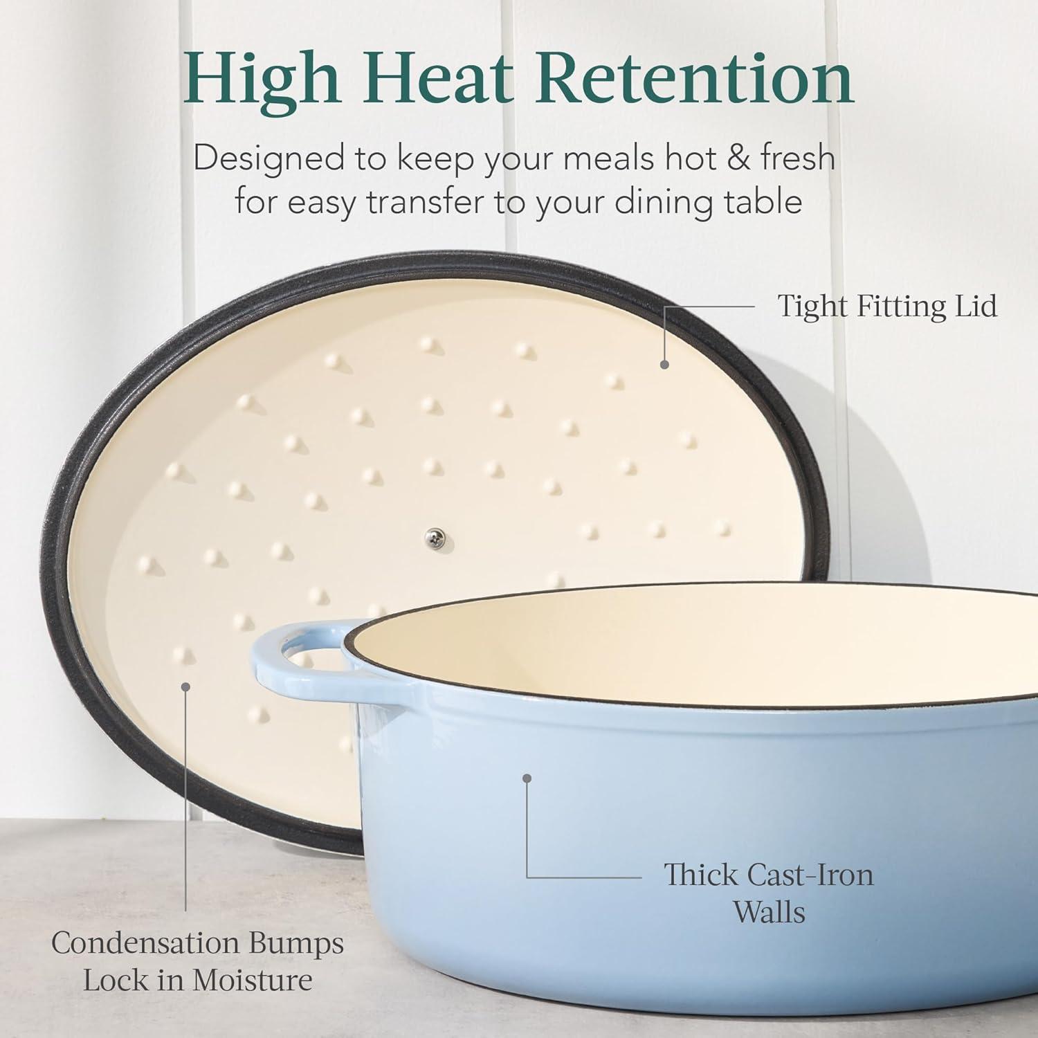 HIGH HEAT RETENTION: Built to reach and maintain temperatures up to 480 degrees Fahrenheit, a set of condensation bumps on the heavy lid helps seal in moisture, heat, and flavor