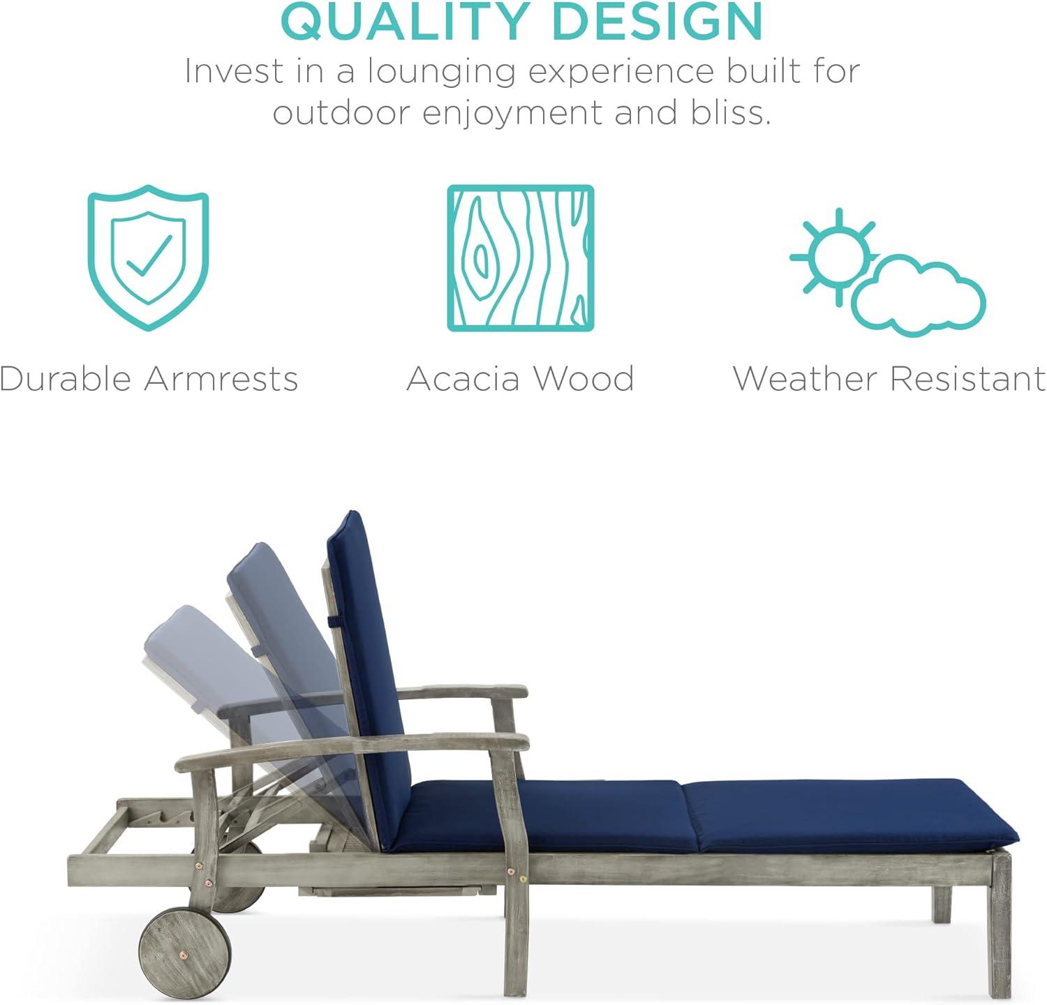 Best Choice Products 79x26in Acacia Wood Chaise Lounge Chair Recliner, Outdoor Furniture for Patio, Poolside w/Slide-Out Side Table, Foam-Padded Cushion, Adjustable Backrest, Wheels - Cream(Gray/Navy)