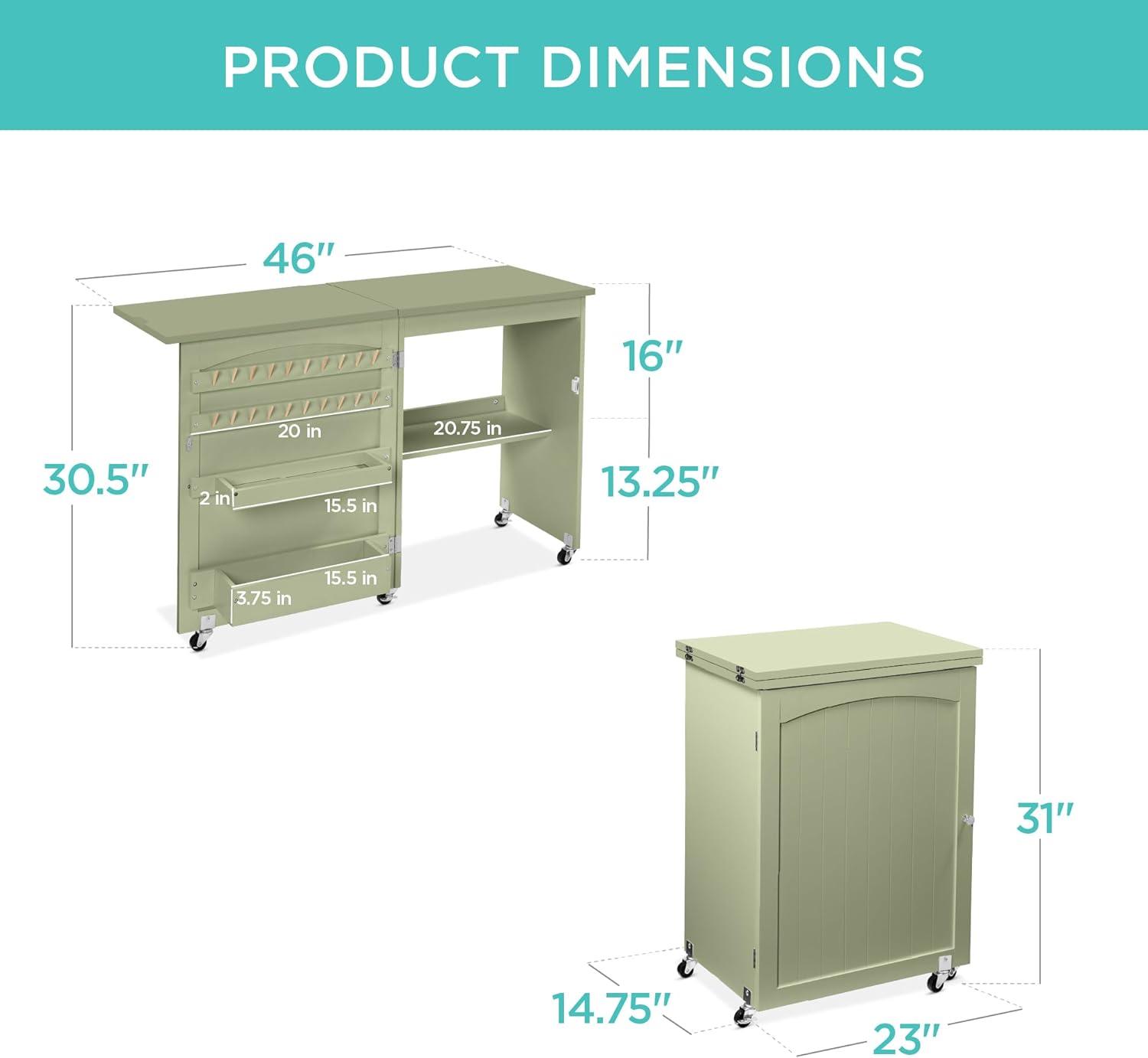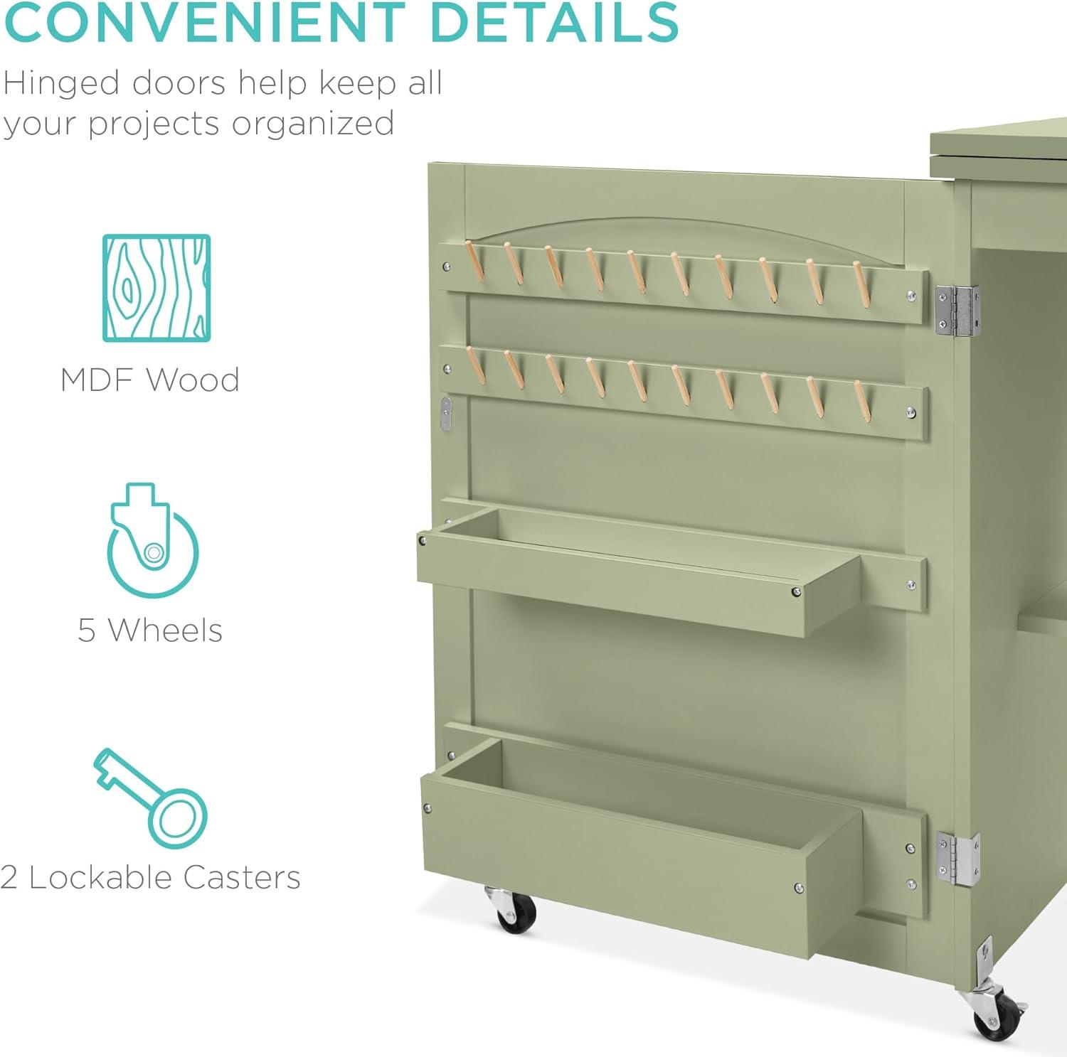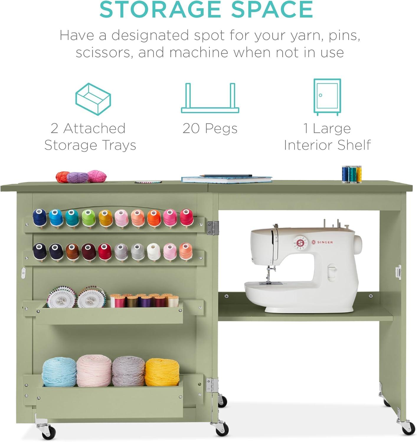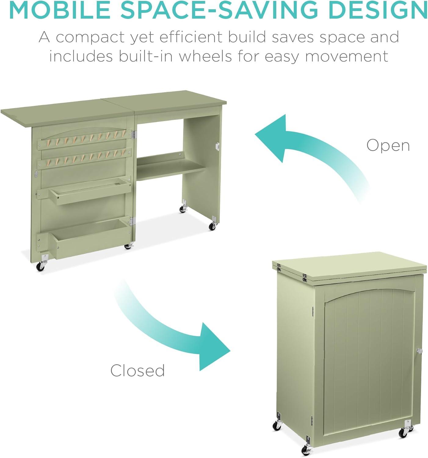 Best Choice Products Folding Sewing Table Multipurpose Craft Station & Side Desk with Compact Design, Wheels, Shelves, Storage Trays, Pegs, Magnetic Doors, Metal Doorknobs - White(Light Green)