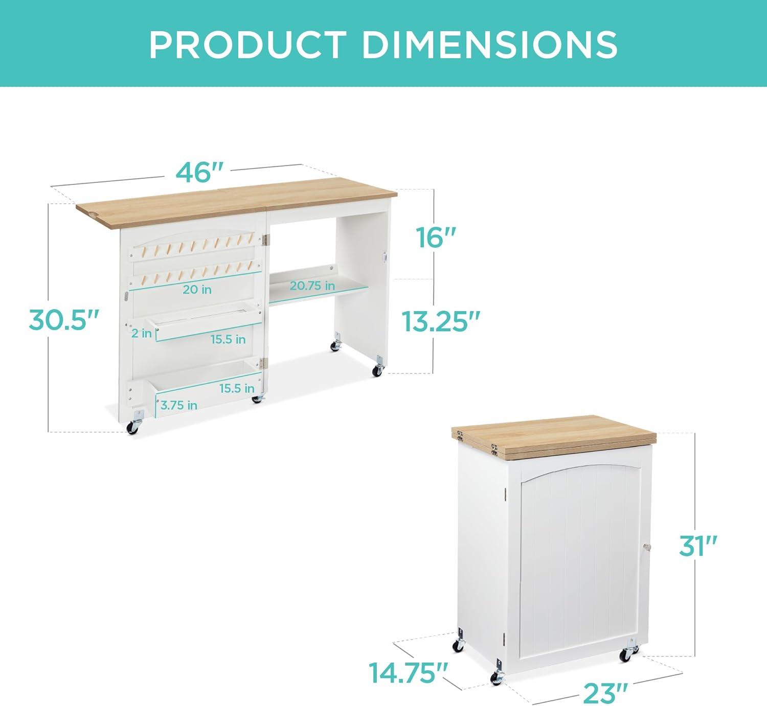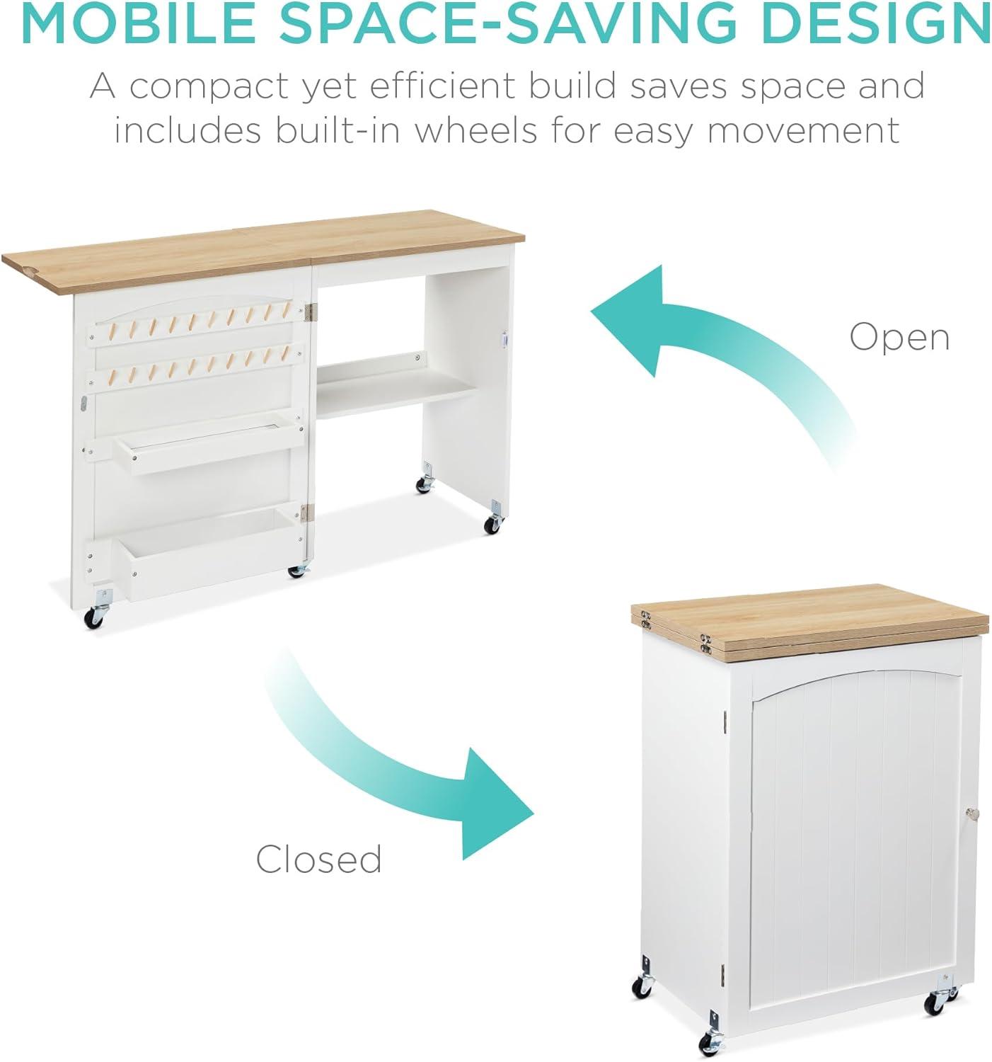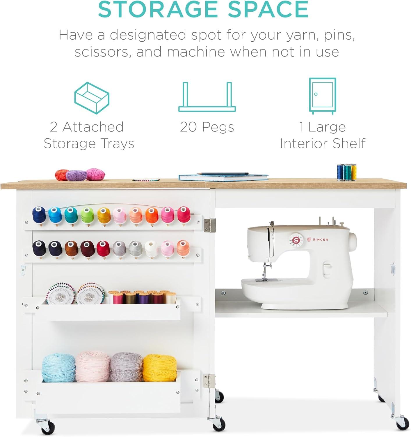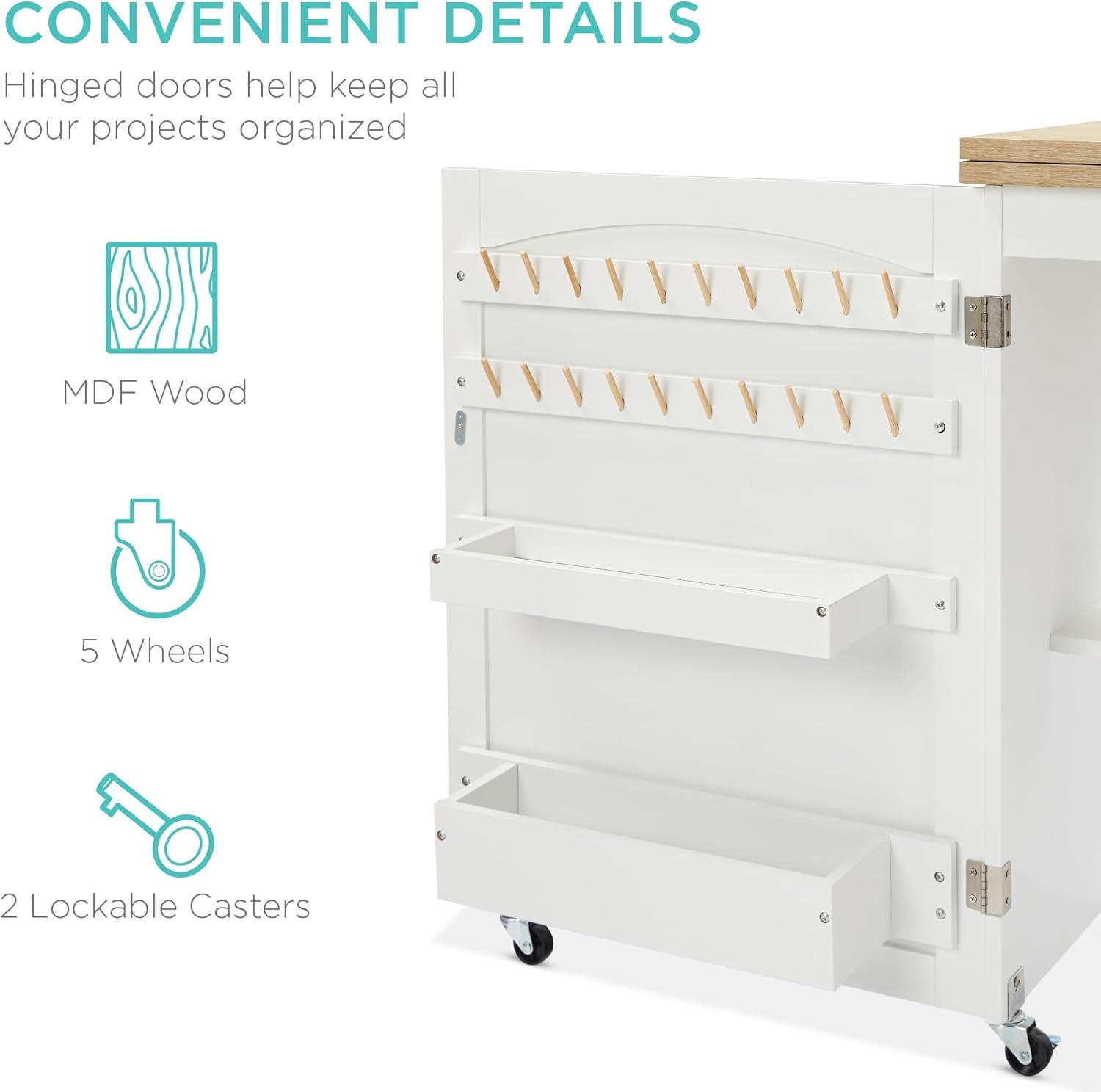 Best Choice Products Folding Sewing Table Multipurpose Craft Station & Side Desk with Compact Design, Wheels, Shelves, Storage Trays, Pegs, Magnetic Doors, Metal Doorknobs - White(Natural/White)