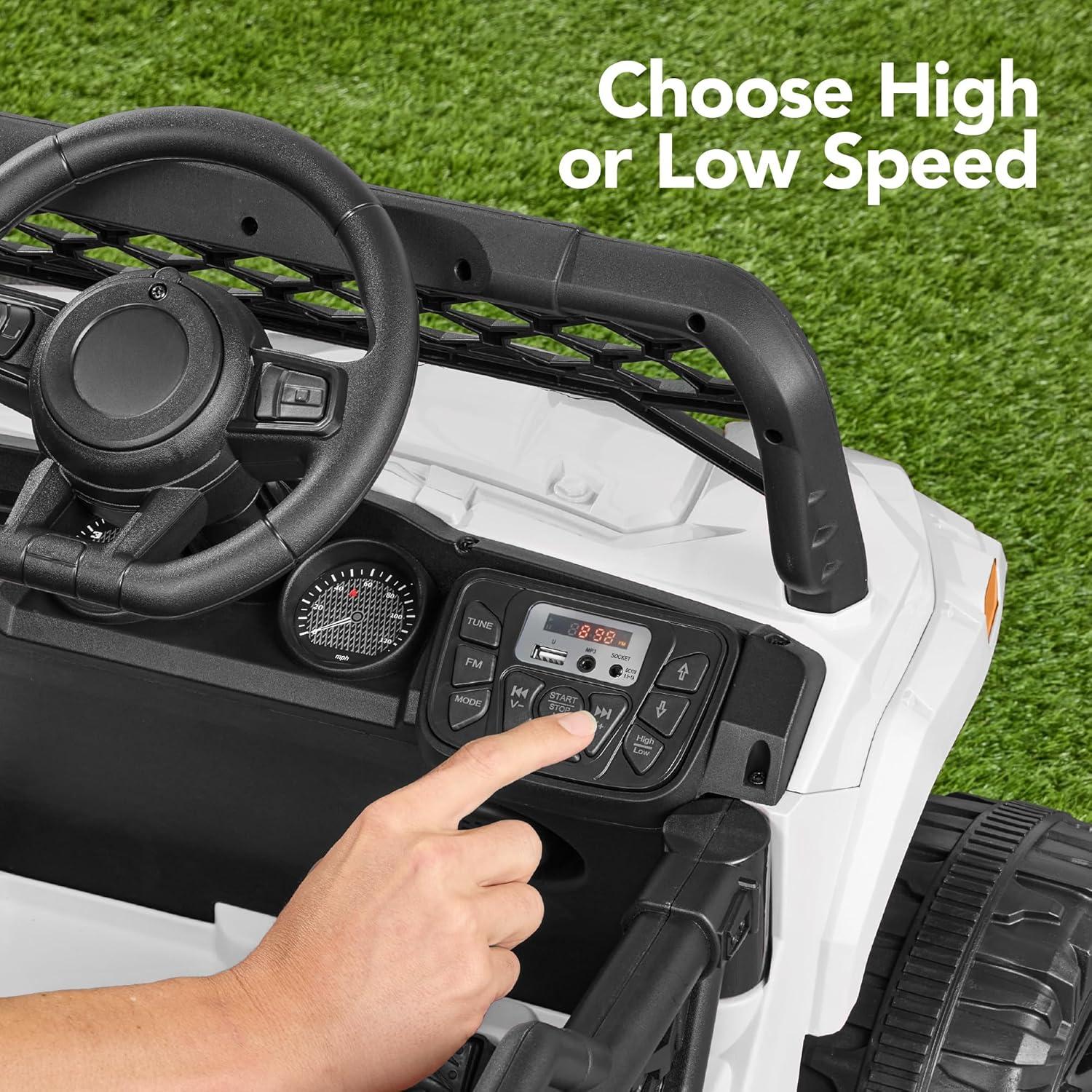 CHILD-FRIENDLY DESIGN: Made to seat one child, this ride-on includes an adjustable seat harness to secure your child while in motion, treaded plastic wheels, LED headlights, and 2 driving speeds to suit your child's needs