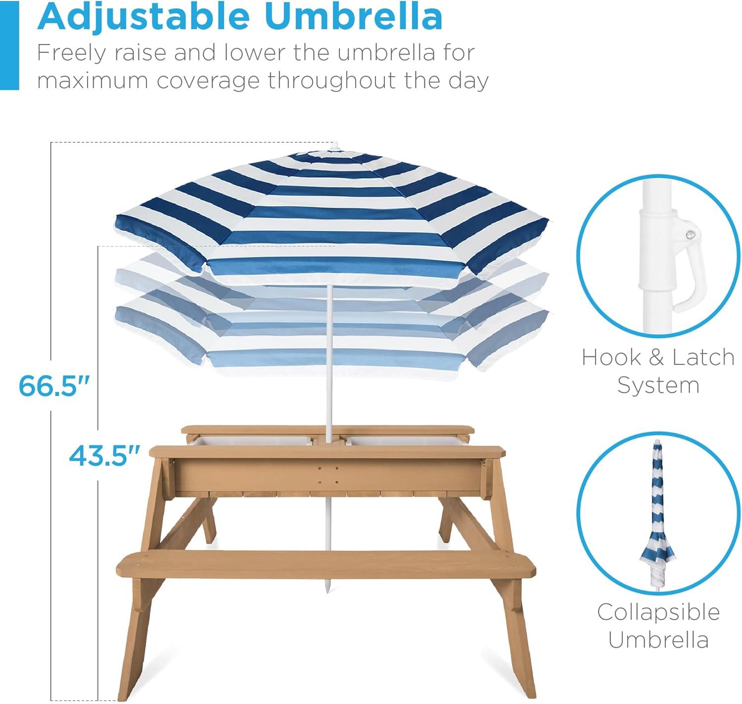 Best Choice Products Kids 3-in-1 Sand & Water Table, Wood Outdoor Convertible Picnic Table w/Umbrella, 2 Trays, Removable Top, 220lb Capacity Per Bench -Green(Walnut/Beige)