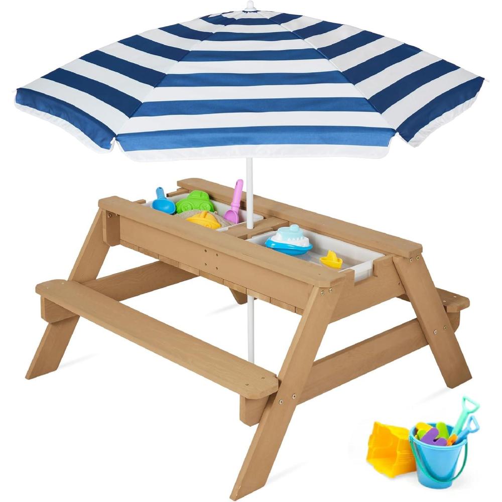 3-IN-1 DESIGN: Remove the table top to reveal two plastic activity bins and turn this picnic set into either a sand table or a water table! NOTE: Play-grade sand is sold separately