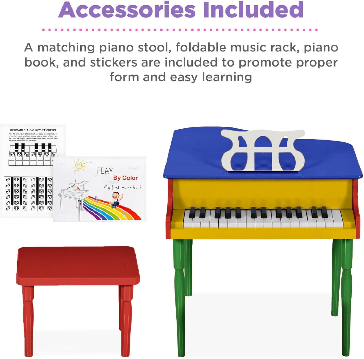 Best Choice Products Kids Classic Wooden 30-Key Mini Grand Piano Musical Instrument Toy w/ Piano Lid, Bench, Foldable Music Rack, Song Book, Note Stickers, Enamel Finish – Black(Multi-Color)