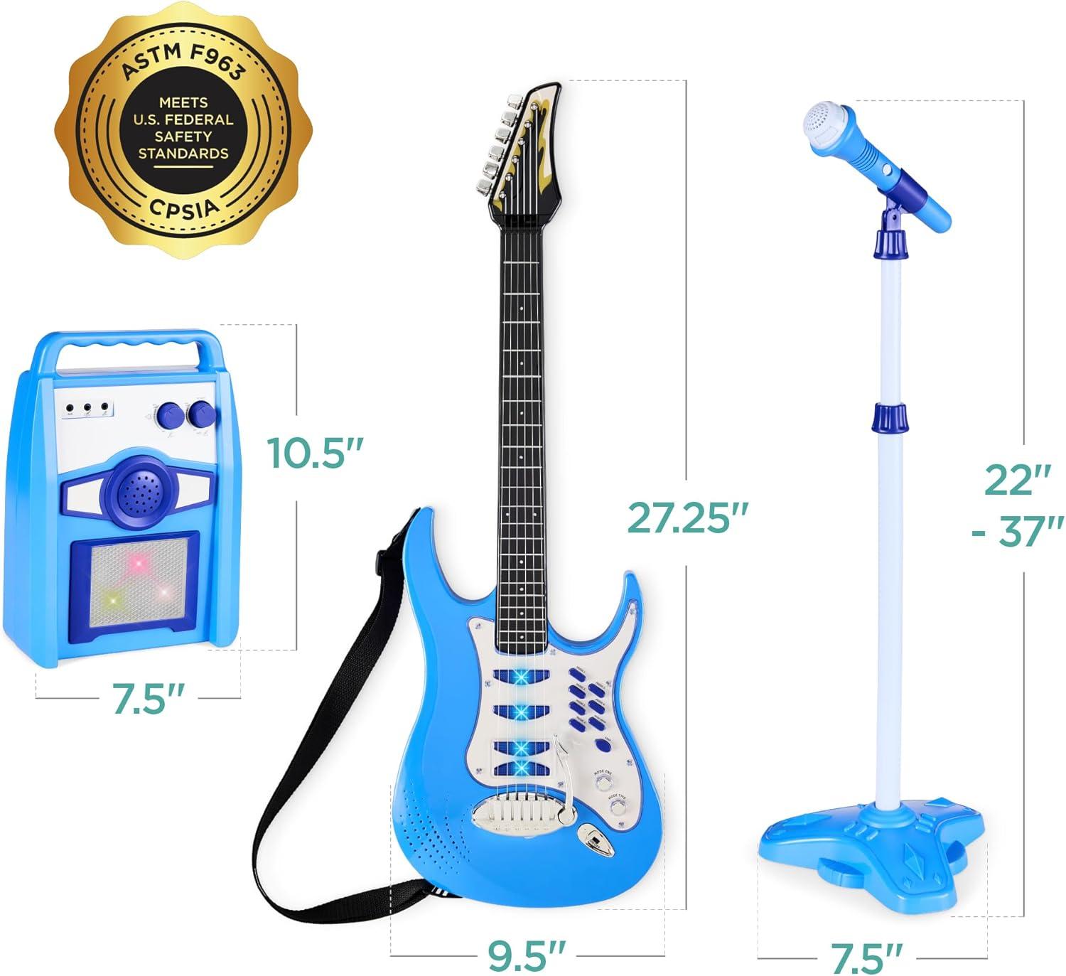 CHILD-FRIENDLY DESIGN: Your child will enjoy playtime thanks to a durable design that features beveled edges to help reduce the chance of injury; GUITAR DIMENSIONS: 9.5″(L) x 1″(W) x 27.25″(H)