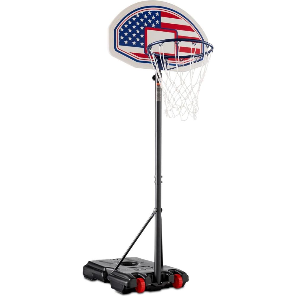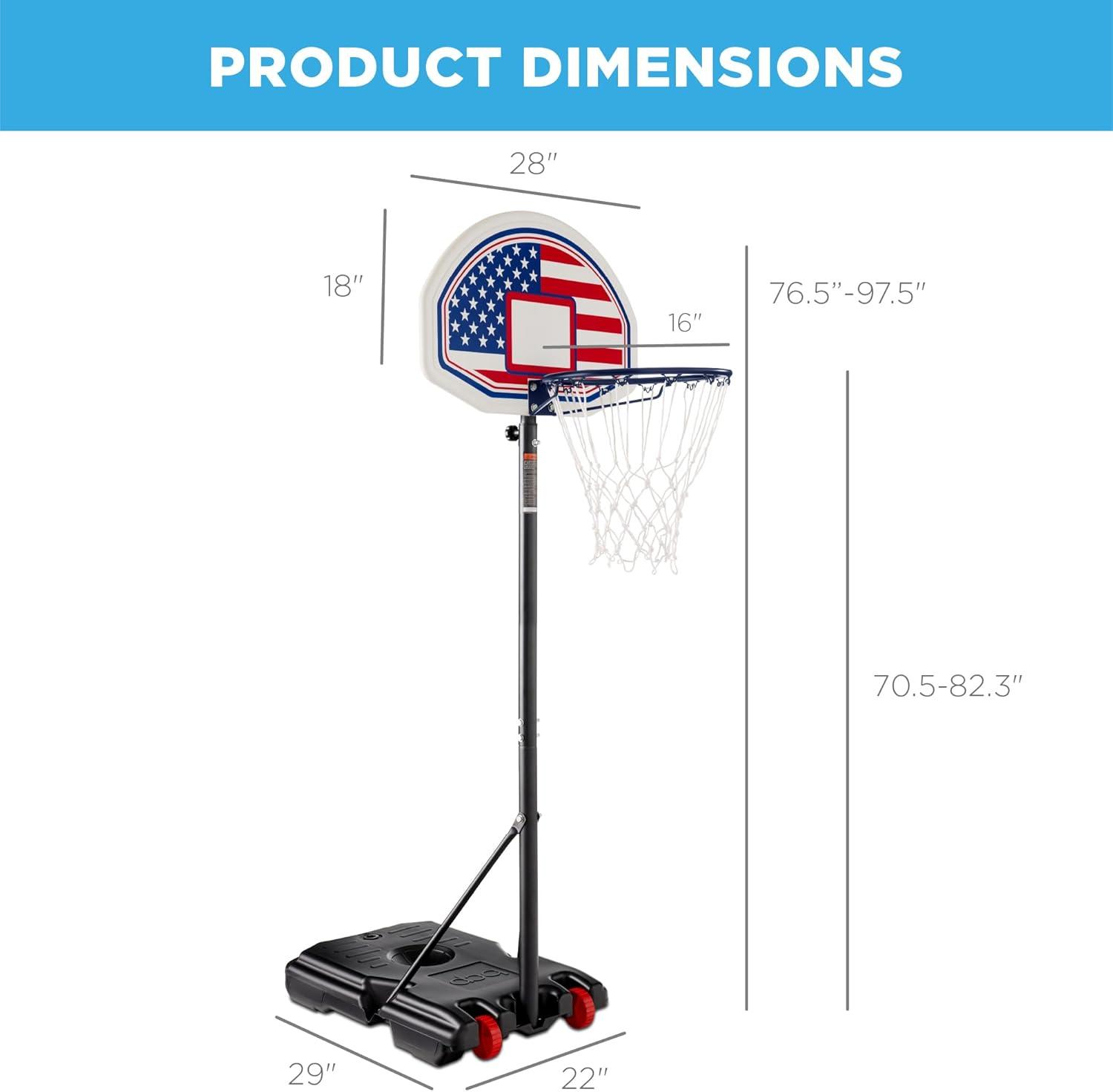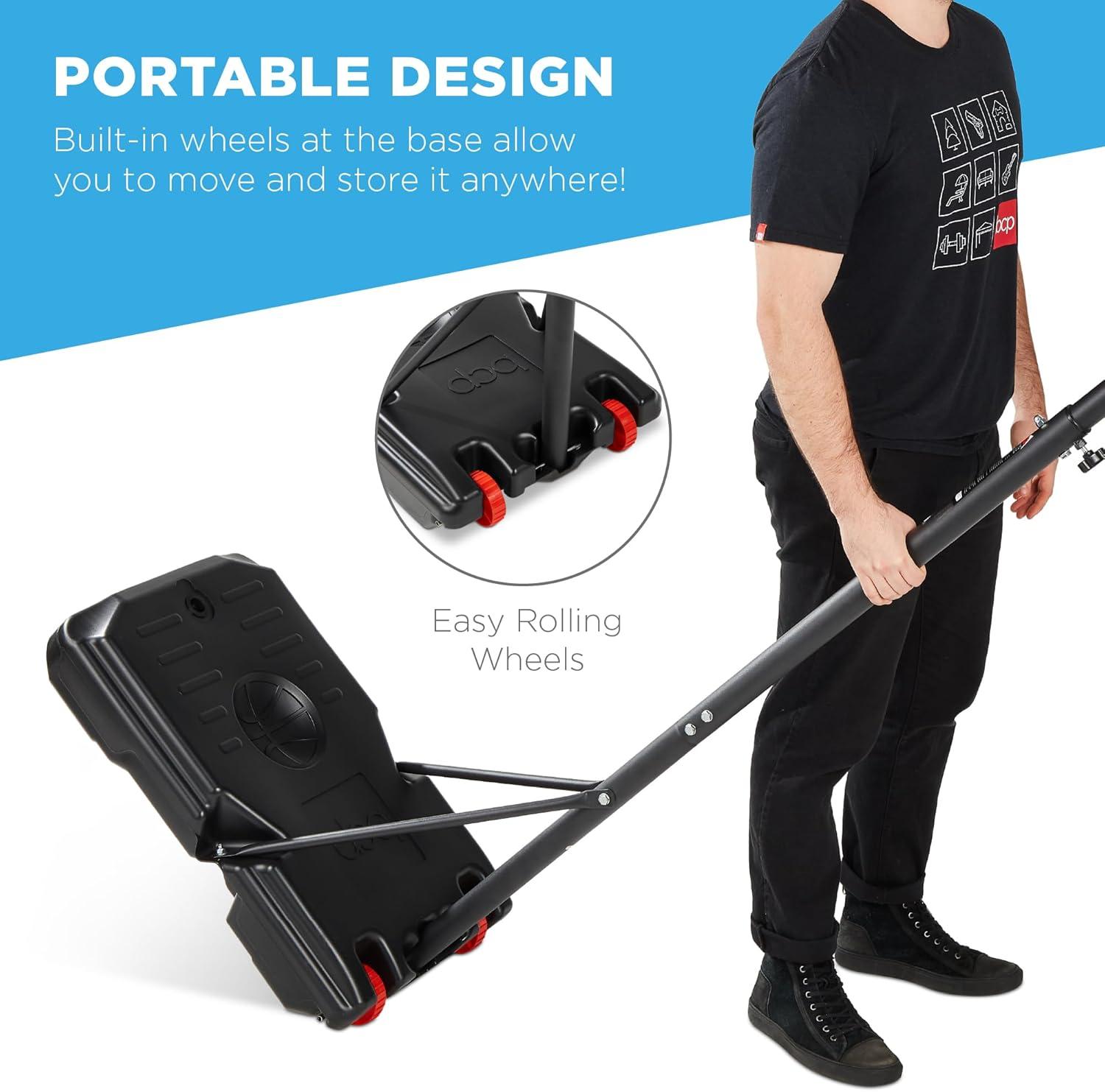 PORTABLE DESIGN: Two built-in wheels at the front of the base make this hoop easy to tilt and transport to any area of your front yard, backyard, in or out of your house; OVERALL DIMENSIONS: 29″(L) x 22″(W) x 86″-97″(H); BASE CAPACITY: 38-40L (water), 54-56L (sand)