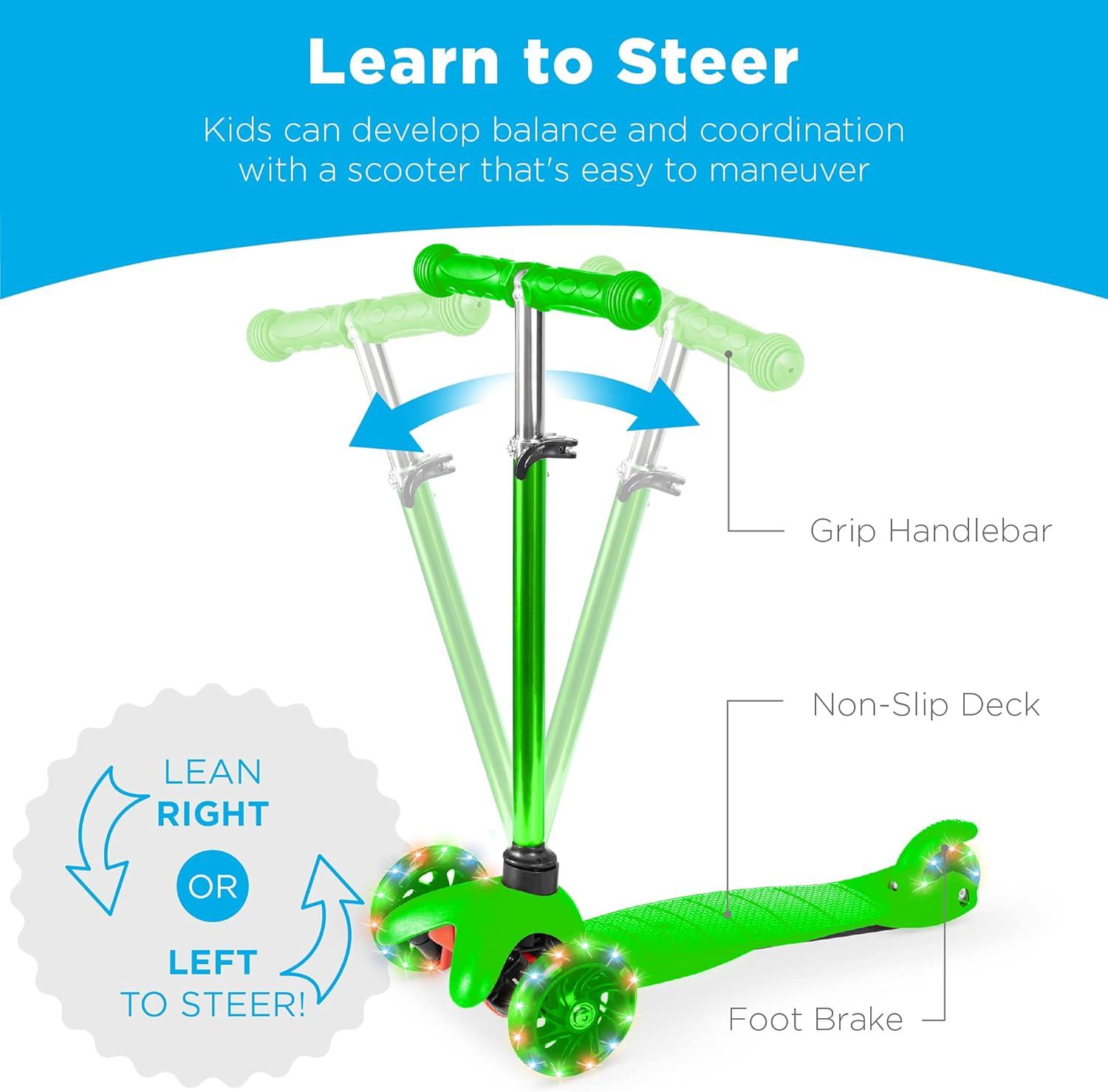 ADJUSTABLE HEIGHT: Kids 3 years and older can enjoy this LED light-up scooter as they grow in age and skill. An easily adjustable handlebar tailors to their growing height
