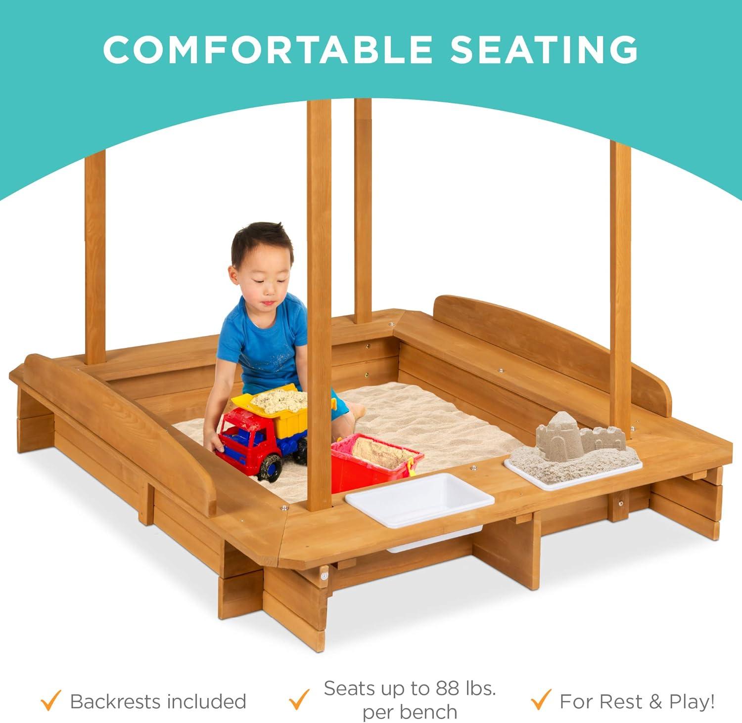 BUILT TO LAST: Solid, stained fir wood is non-toxic and sturdy to help ensure a secure play area; includes a water- and UV-resistant cover to keep sand dry even when it rains