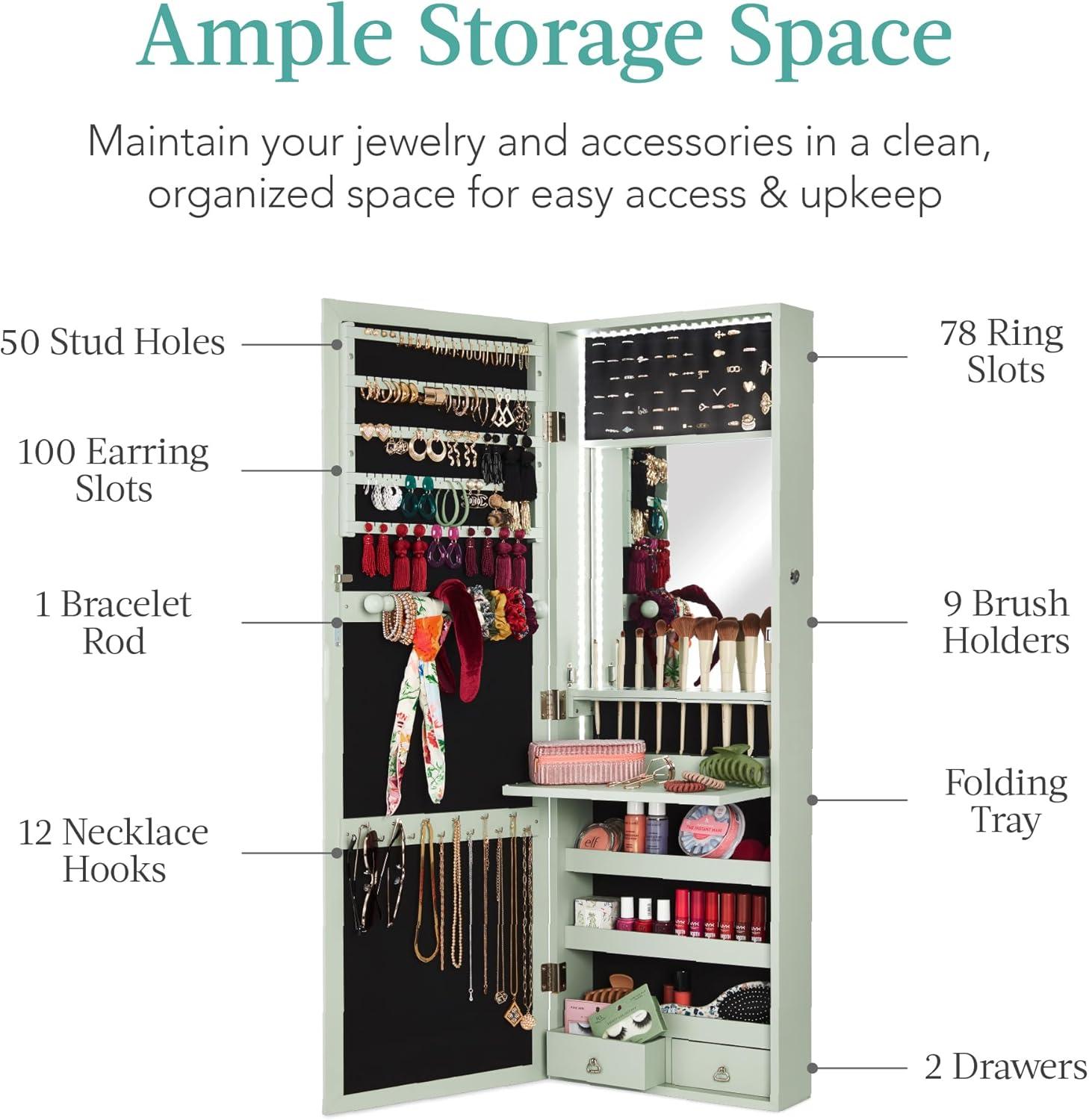 AMPLE STORAGE SPACE: Answer all your storage needs with 2 cubbies, 3 standard shelves, 1 folding shelf, and dedicated spaces like 12 necklace hooks, 78 ring slots, 100 earring hooks, 9 brush holders, 50 stud holes, and bracelet rod with velvet lining.