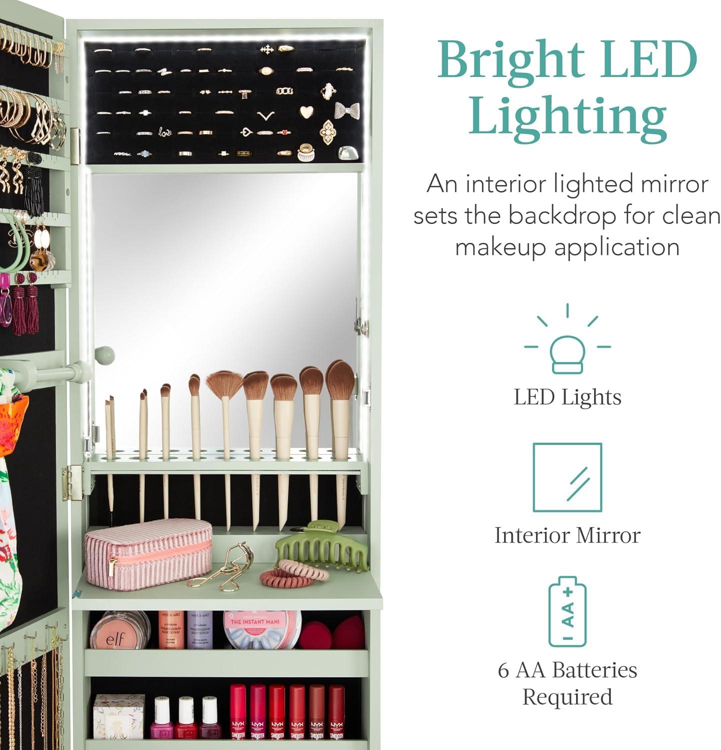 imageBest Choice Products LED Mirror Jewelry Cabinet Tall Lockable Wall or Door Mounted Jewelry Armoire Organizer with Mirror 2 Drawers Lock Cosmetic Tray Shelves  WhiteSage
