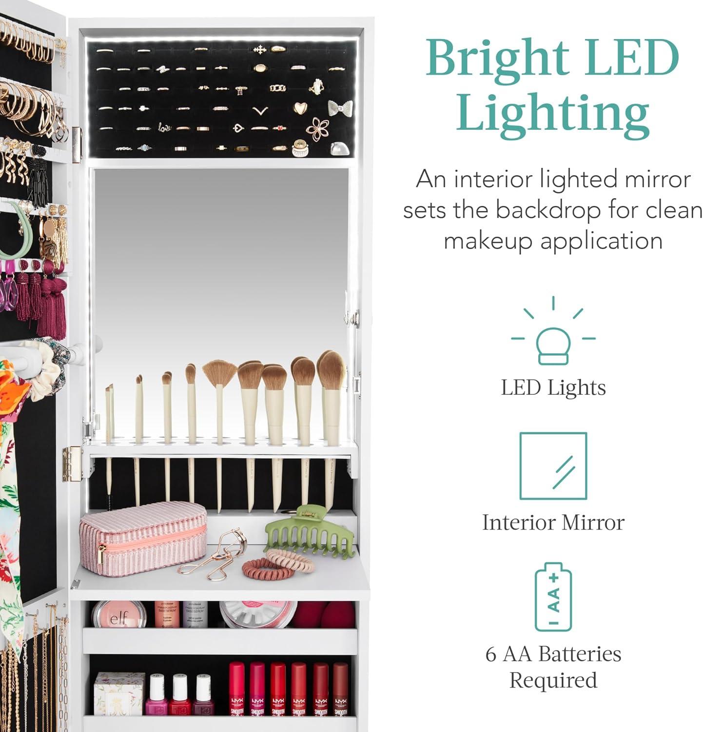 BRIGHT LED LIGHTING: Finish your look with this convenient routine staple! Automatic lights border the interior mirror to provide the perfect setting for cosmetics, jewelry, and accessories
