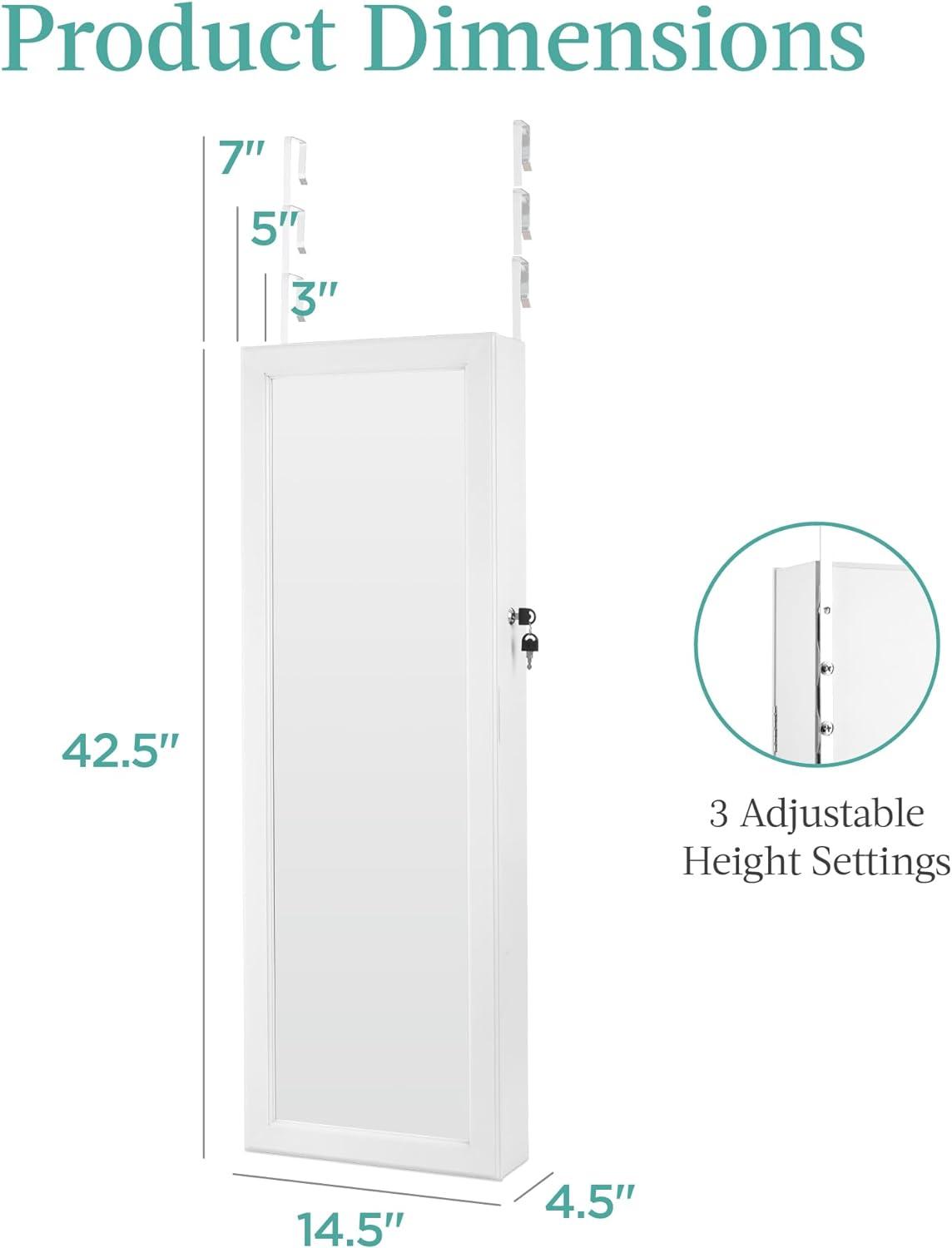 VERSATILE USE: Use the adjustable hooks for easy setup or the wall brackets for more permanent placement; wherever you need it most, you can take advantage of the full-length and interior mirrors to fine tune everything from your make-up to your clothes and accesssories; OVERALL DIMENSIONS: 14.5″(L) x 4.5″(W) x 42.5″(H); WEIGHT CAPACITY: 25 lbs.