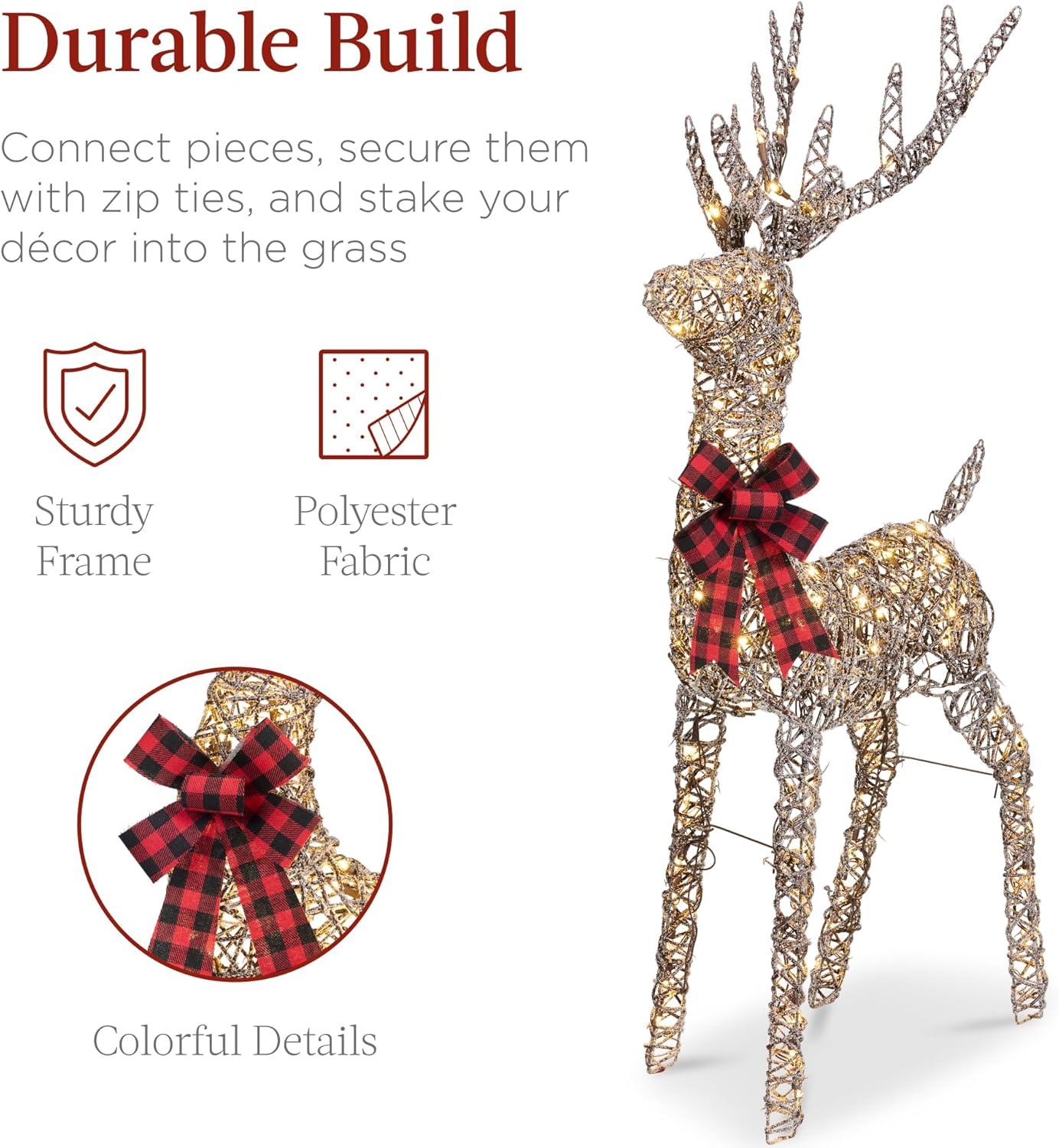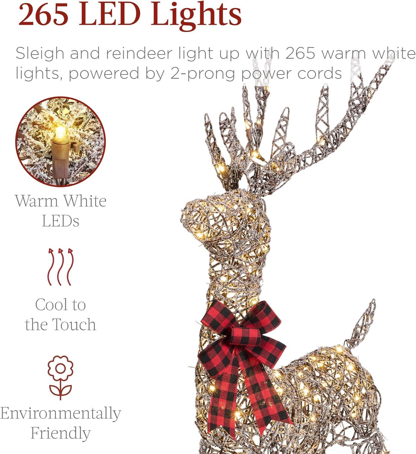 Best Choice Products Lighted Christmas 4ft Reindeer & Sleigh Holiday Outdoor Yard Decoration Set w/ 205 LED Lights, Stakes, Zip Ties - White(Rattan - Extra Large)