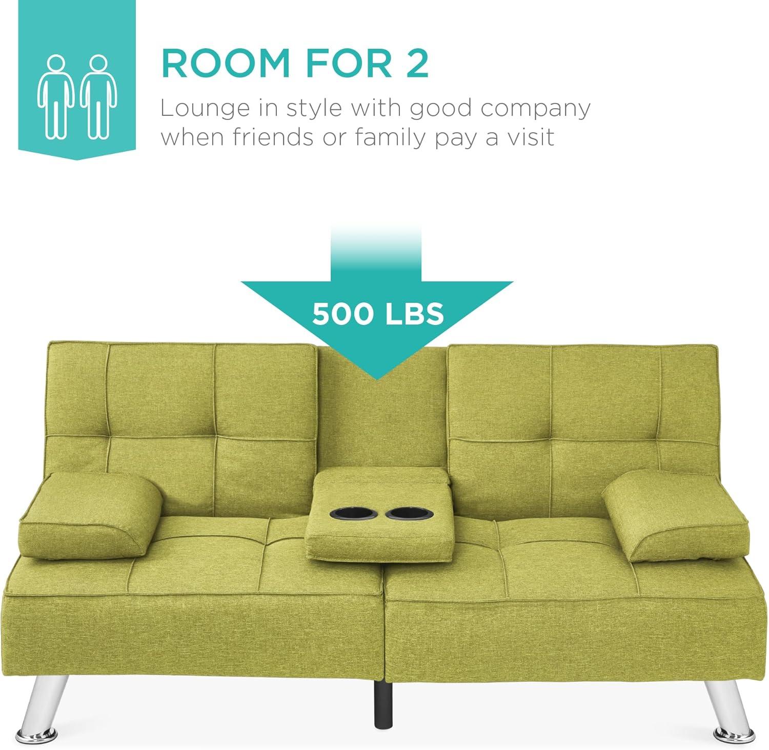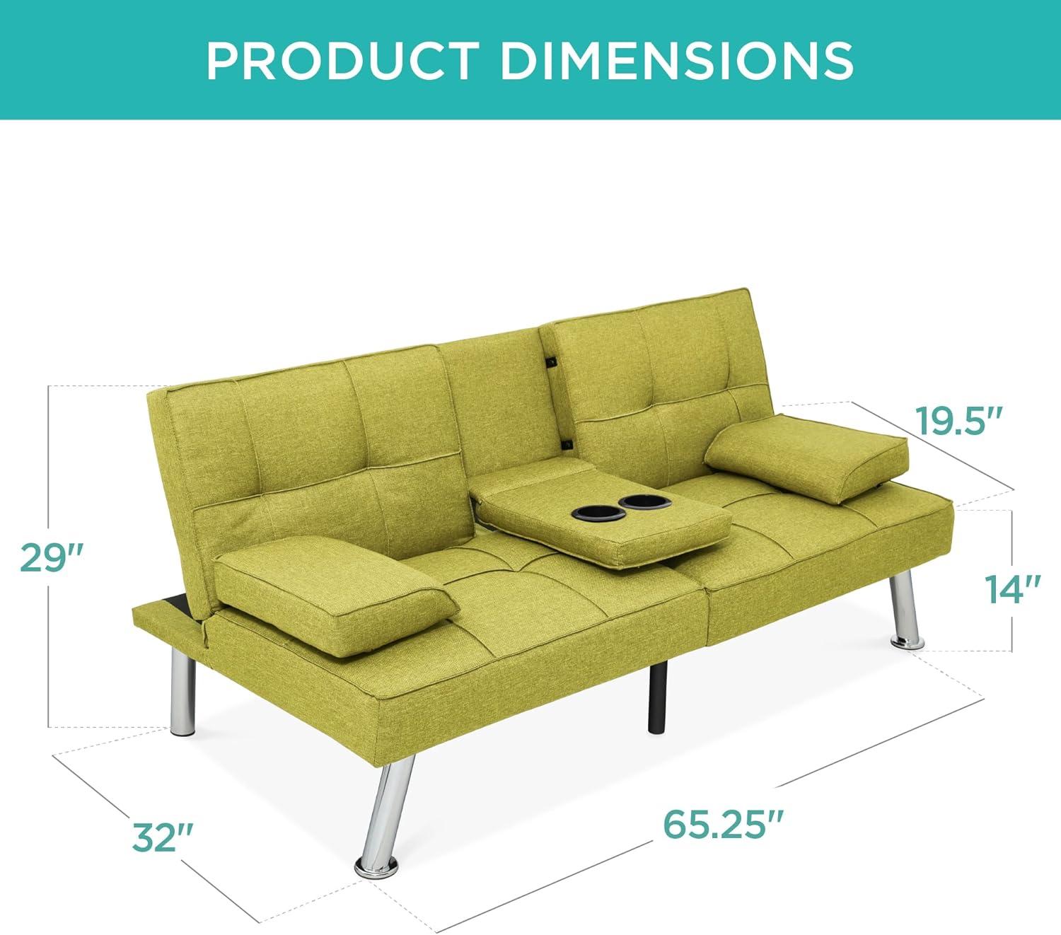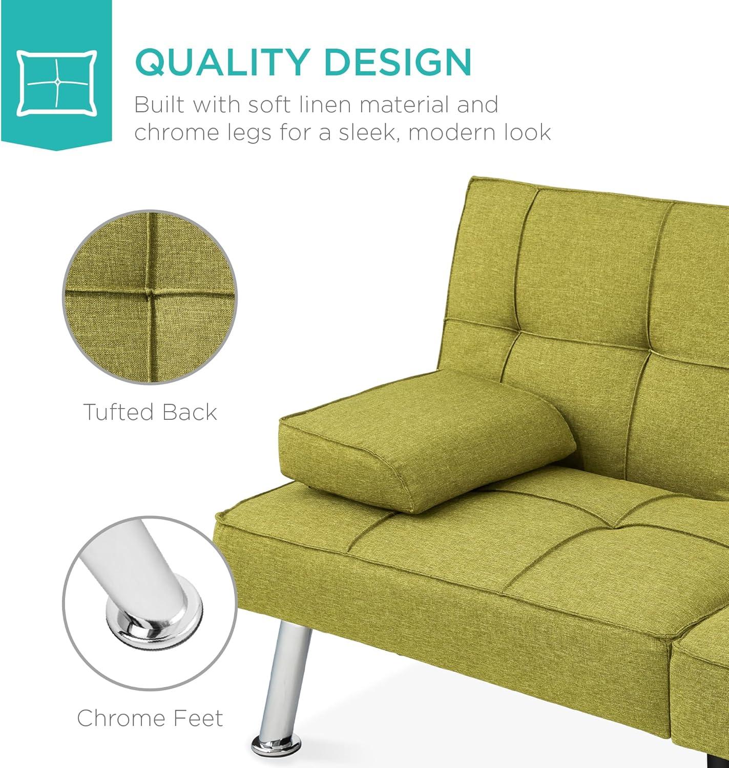 Best Choice Products Linen Modern Folding Futon, Reclining Sofa Bed for Apartment, Dorm w/Removable Armrests, 2 Cupholders – Beige(Chartreuse)