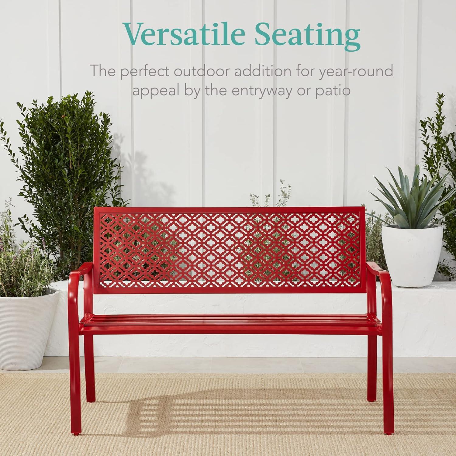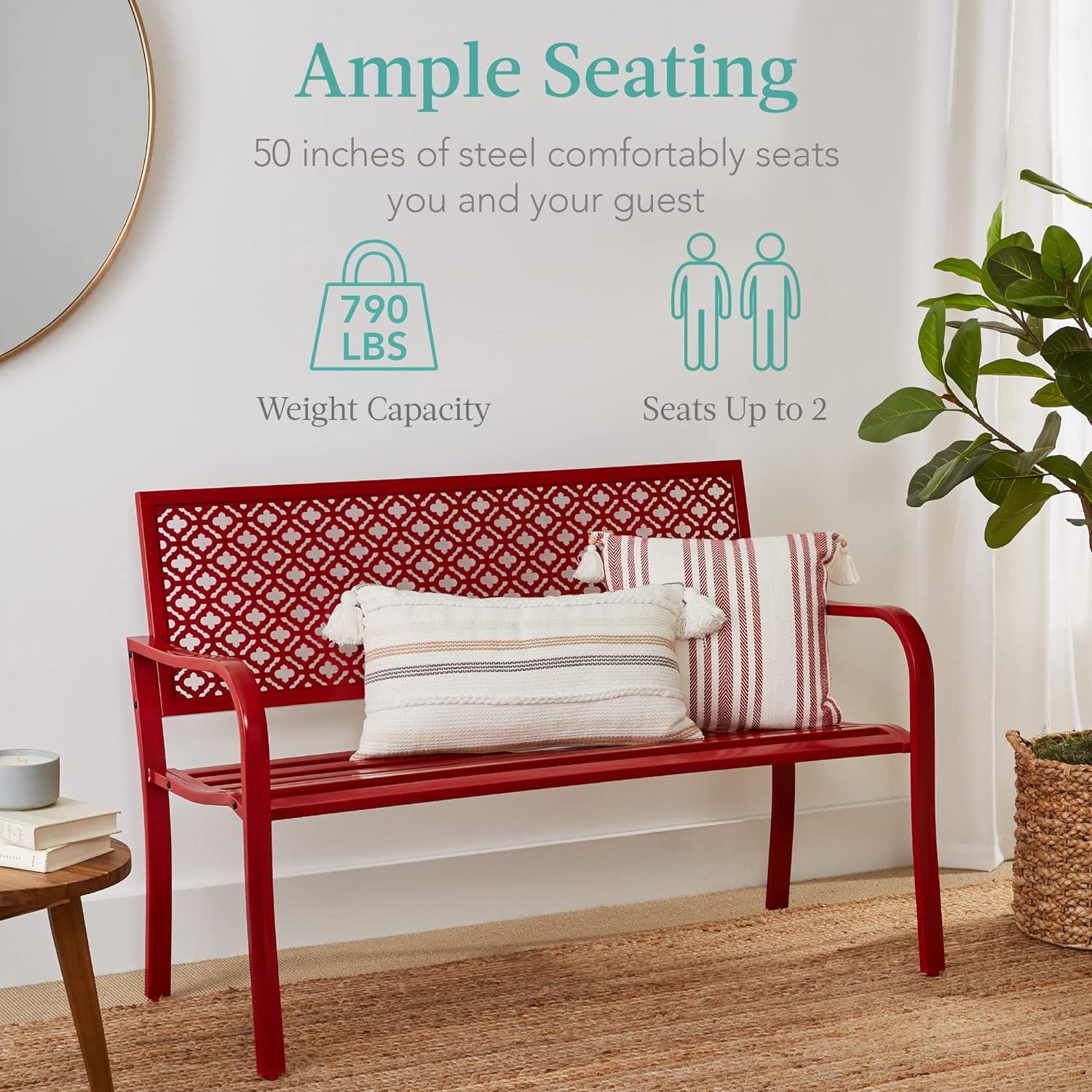Best Choice Products Outdoor Bench 2-Person Metal Steel Benches Furniture for Garden, Patio, Porch, Entryway w/Geometric Backrest, 790lb Capacity – Black(Rose Red)