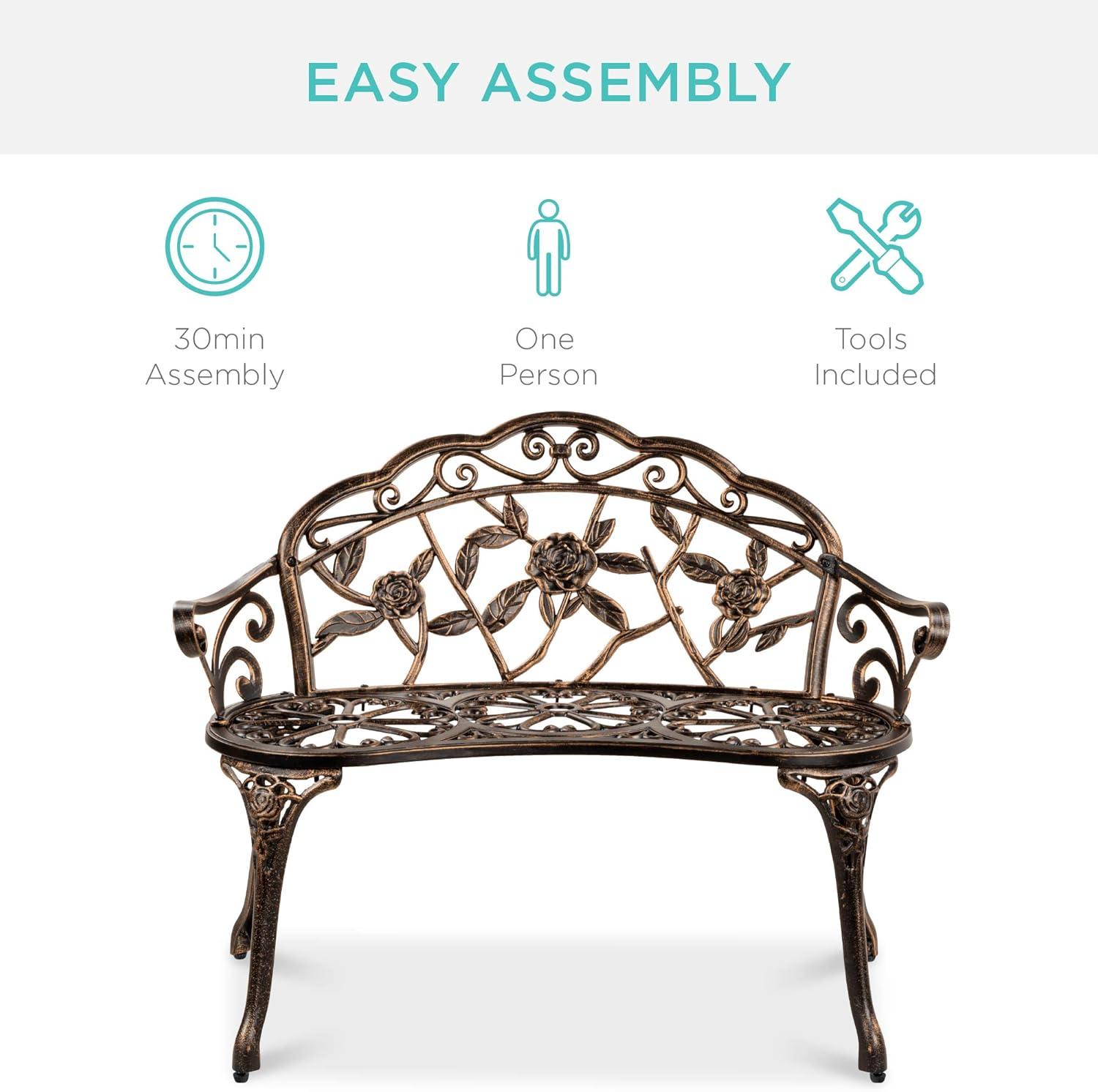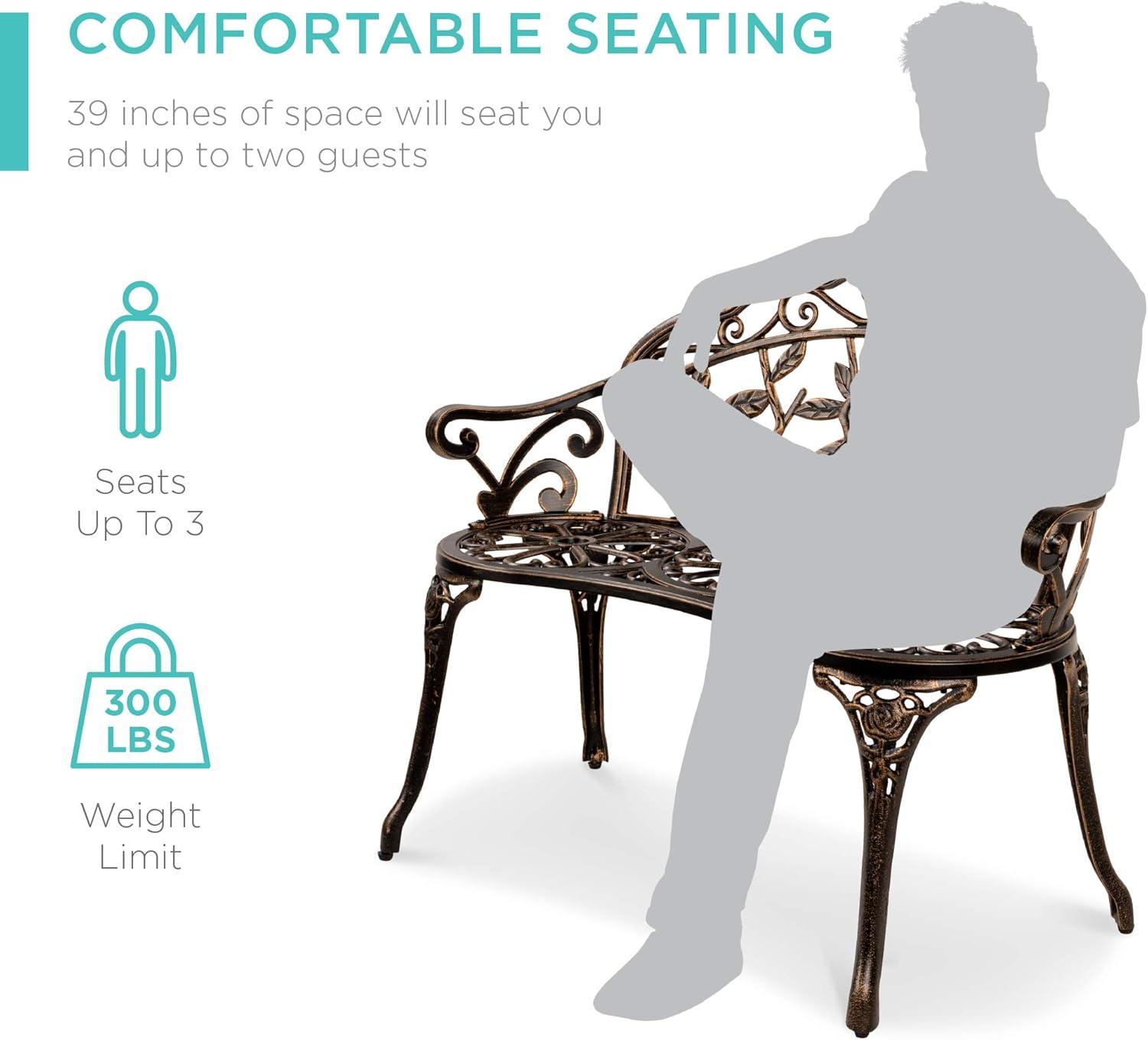 Best Choice Products Outdoor Bench Steel Garden Patio Porch Loveseat Furniture for Lawn, Park, Deck Seating w/Floral Rose Accent, Antique Finish – White(Brown)