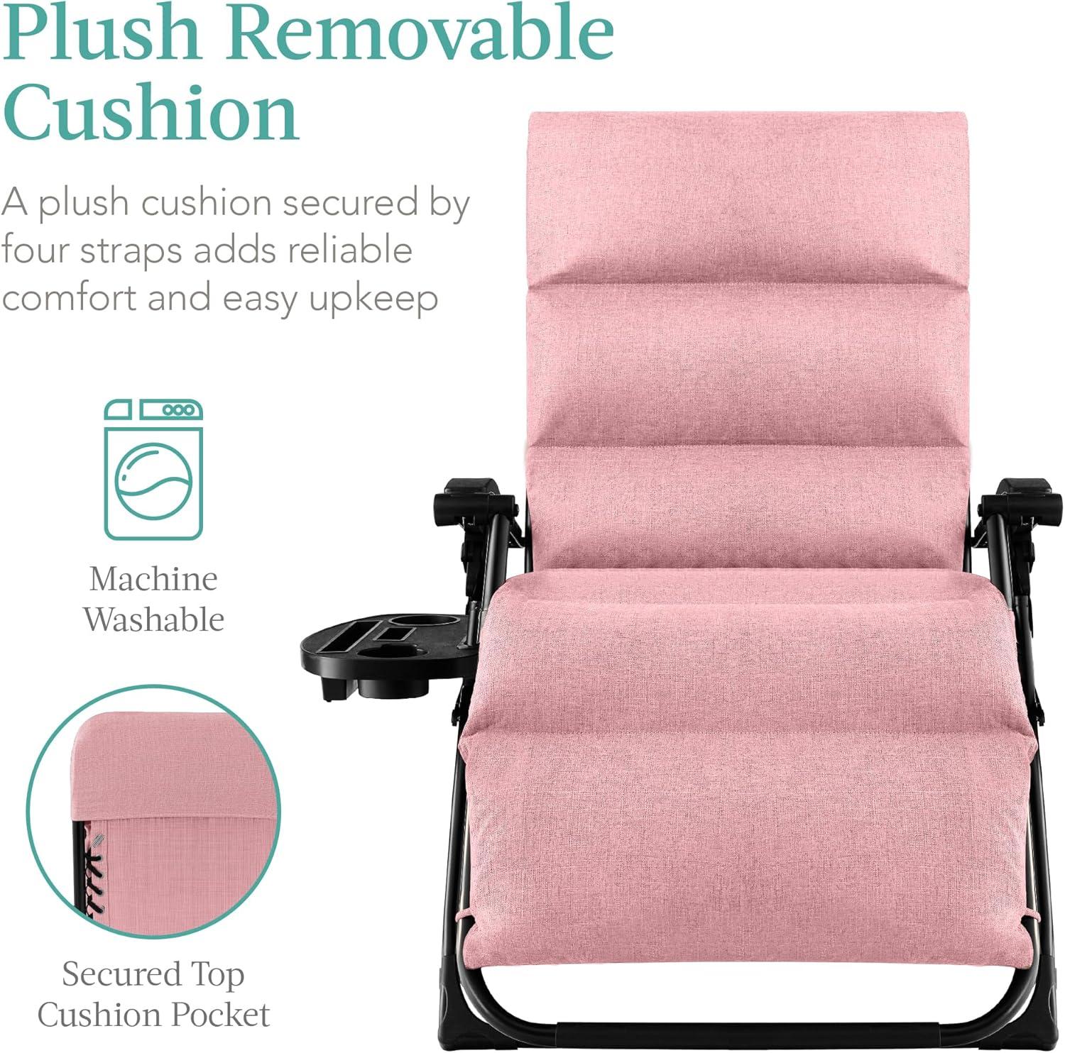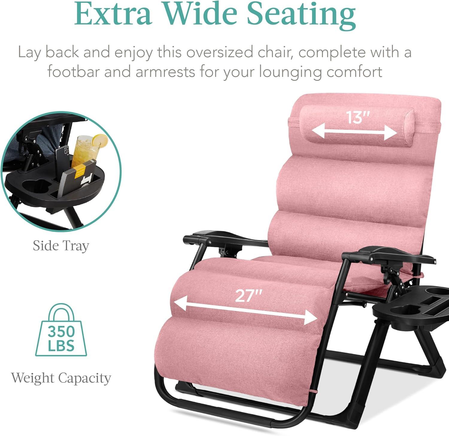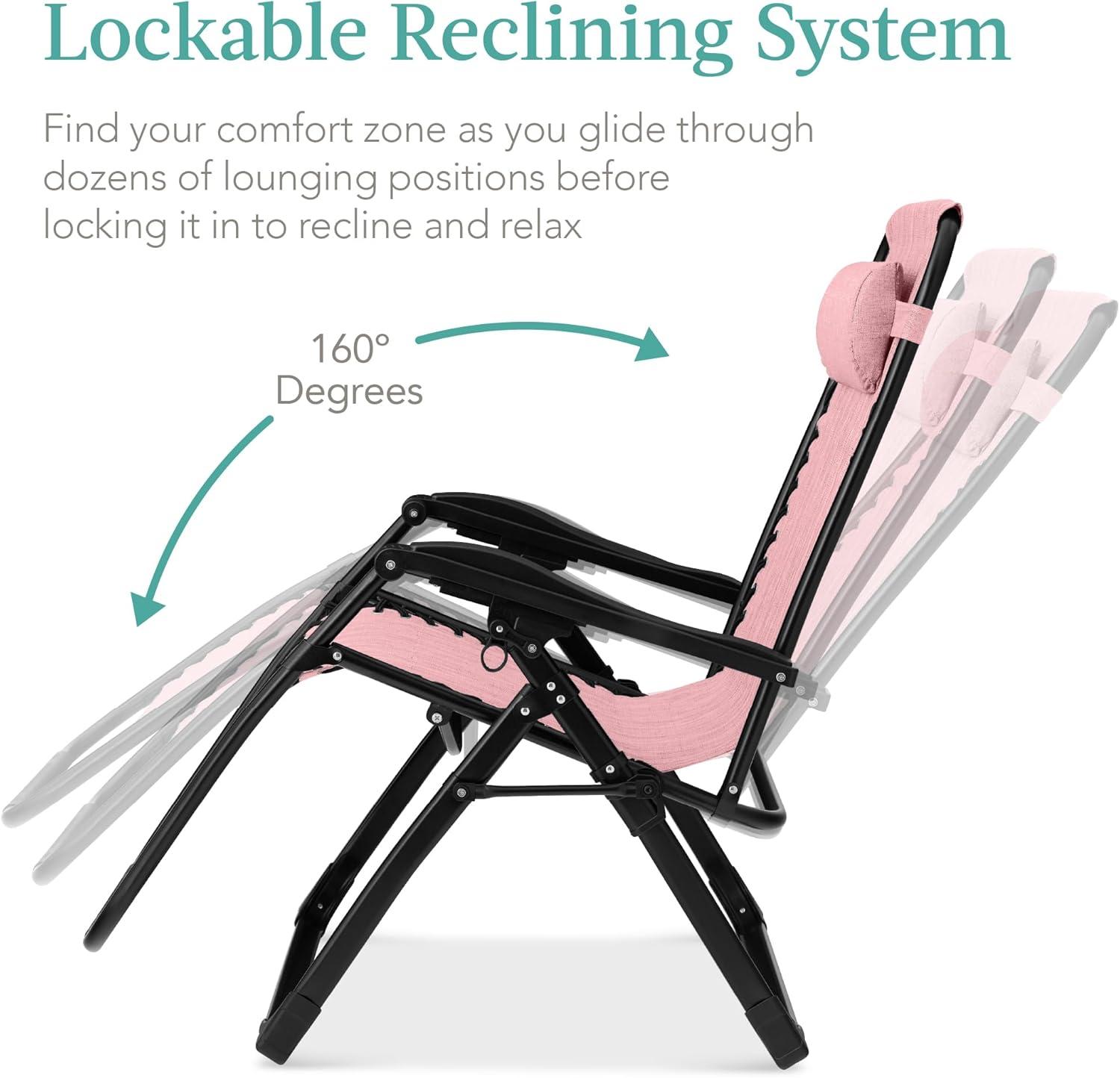 LOCKABLE RECLINING SYSTEM: An extra-wide seat smoothly glides into adjustable zero-gravity positions with a system of locks and elastic cords for extra support