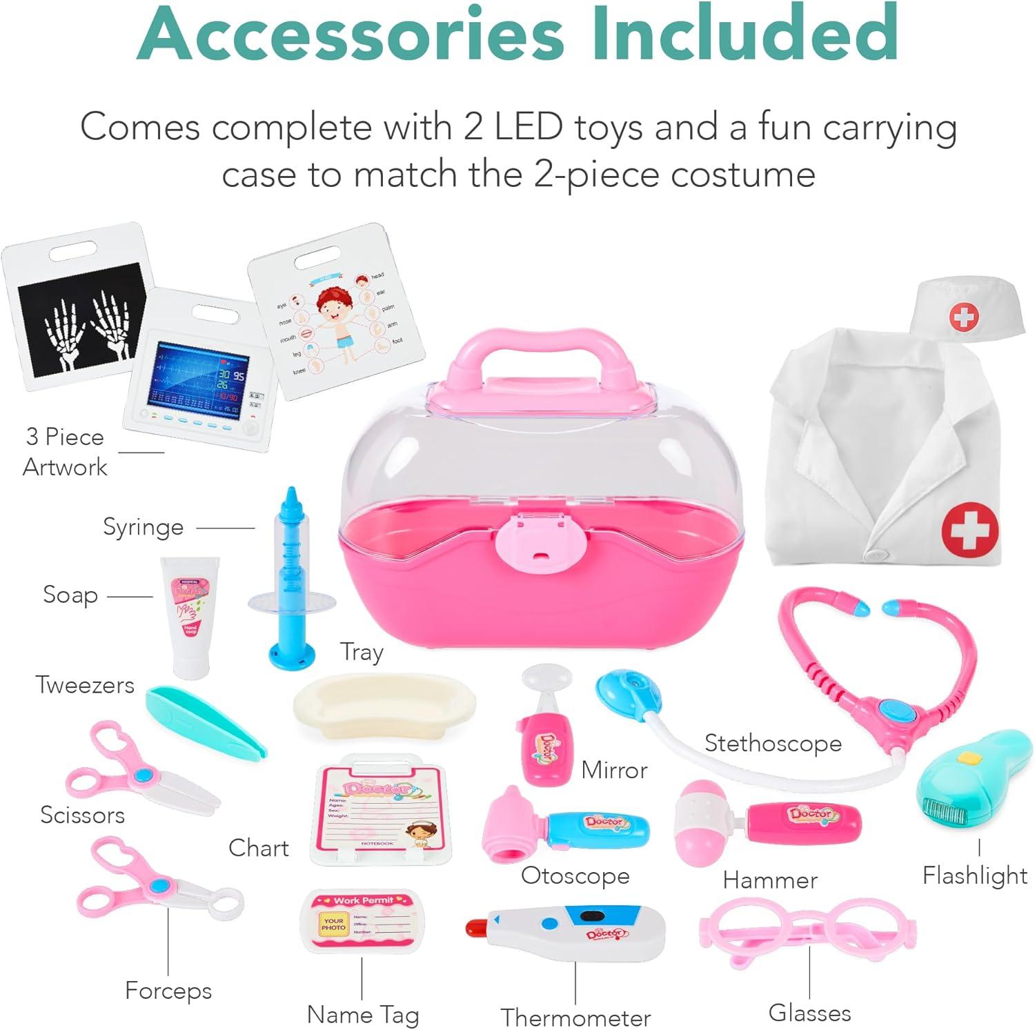 ALL ACCESSORIES INCLUDED: Little doctors can dress up in a 2-piece costume then run diagnostics with a set of 18 toys, including 2 LED tools, a thermometer, an otoscope, and more, all in a handy carrying case