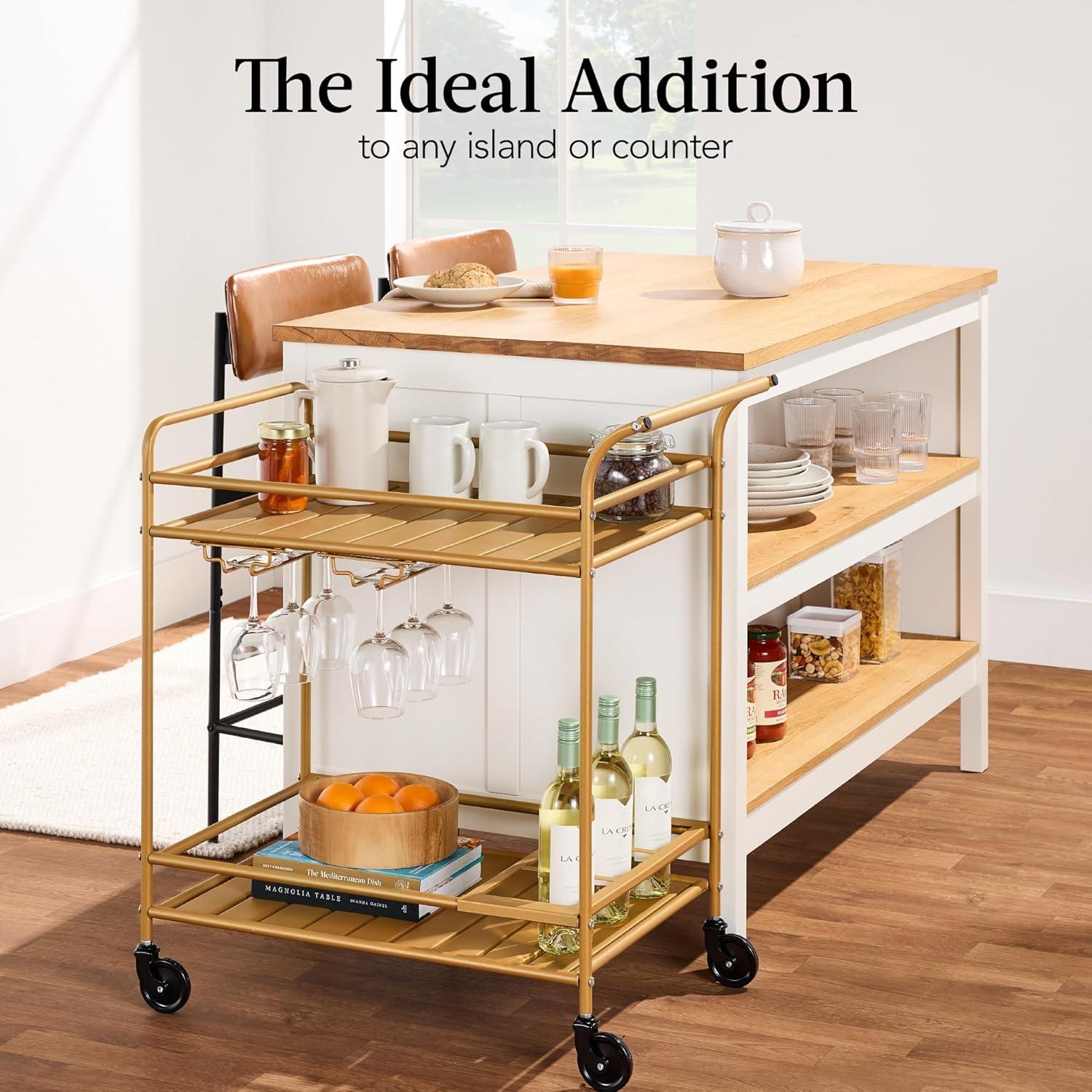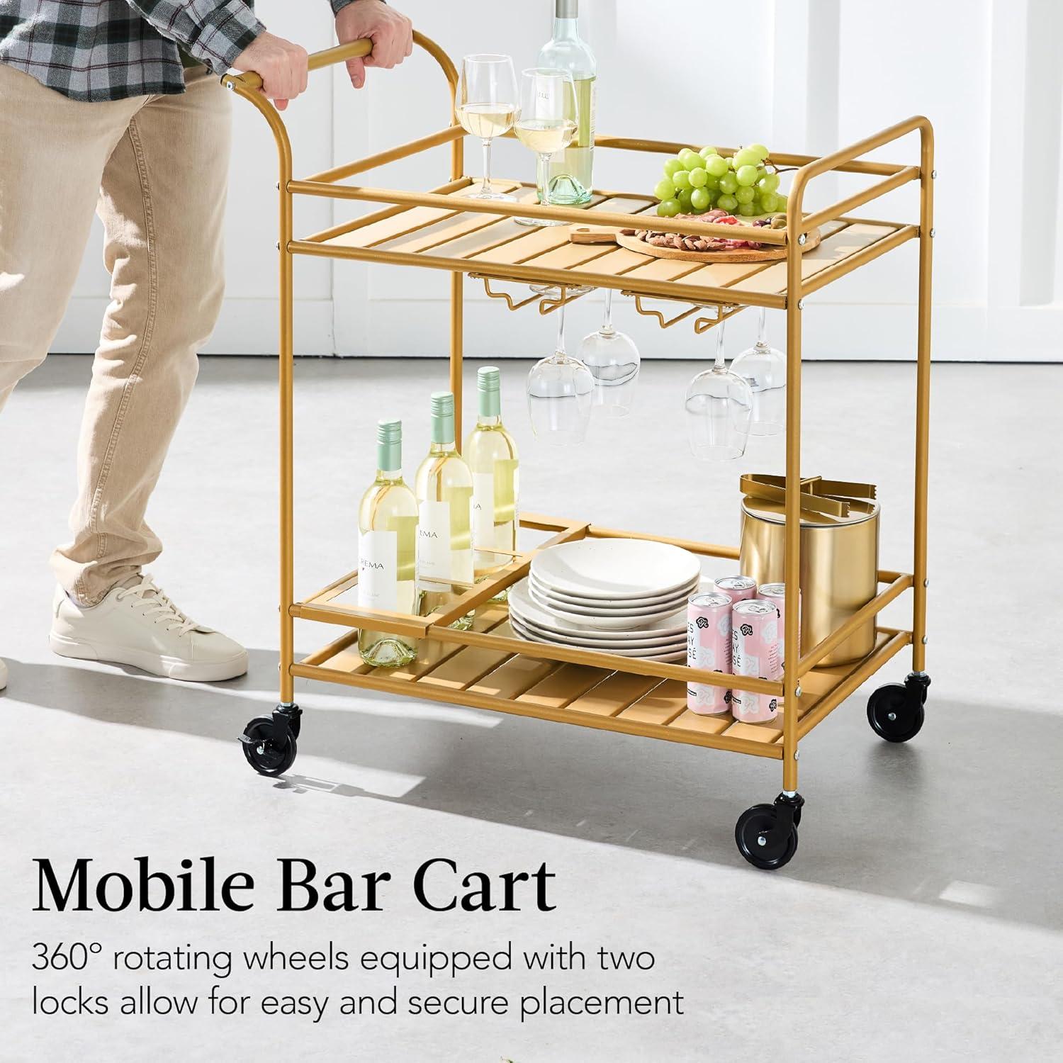 Best Choice Products Rolling Bar Cart, Mobile Home Bar Serving Cart, Serving Station w/ 2 Tier Shelves, Wine Rack, Lockable Wheels – Peacock(Gold)