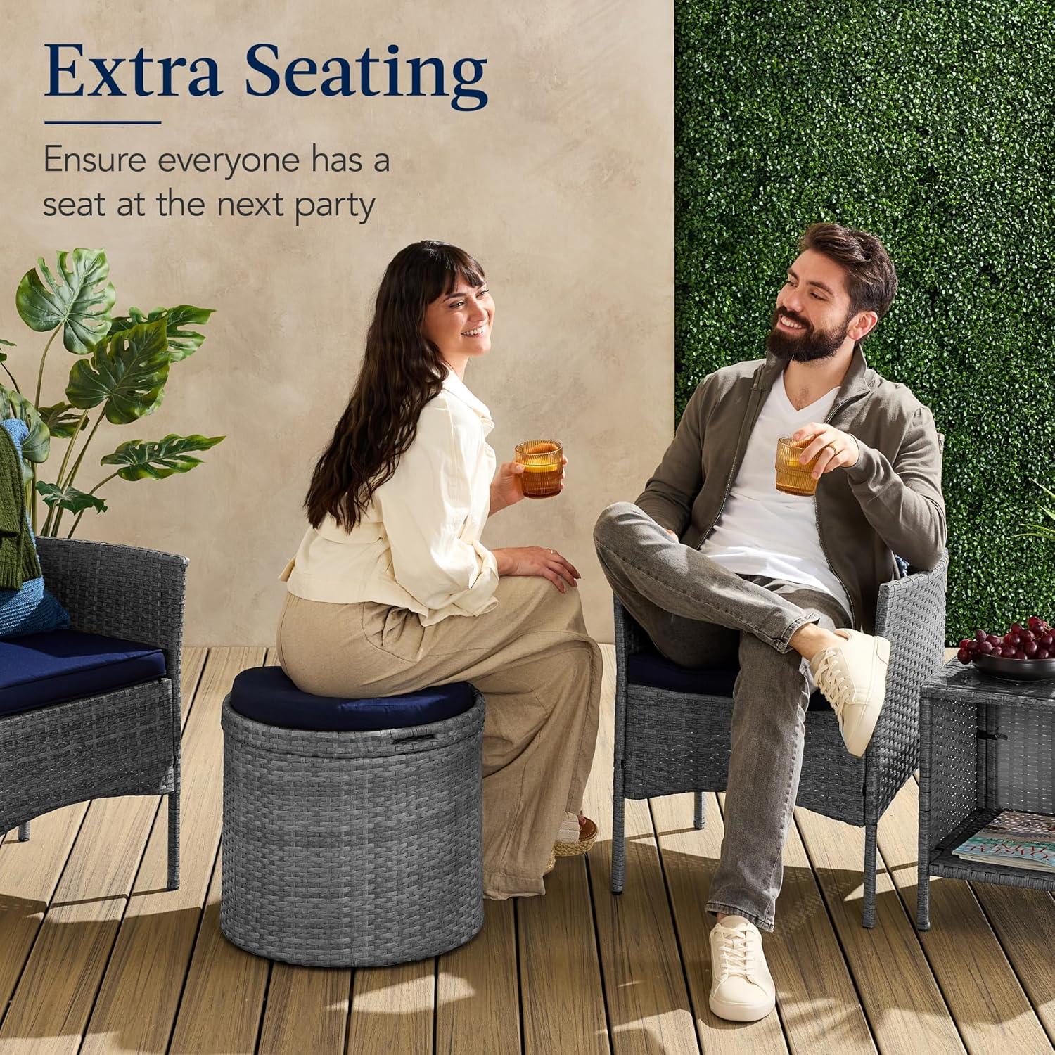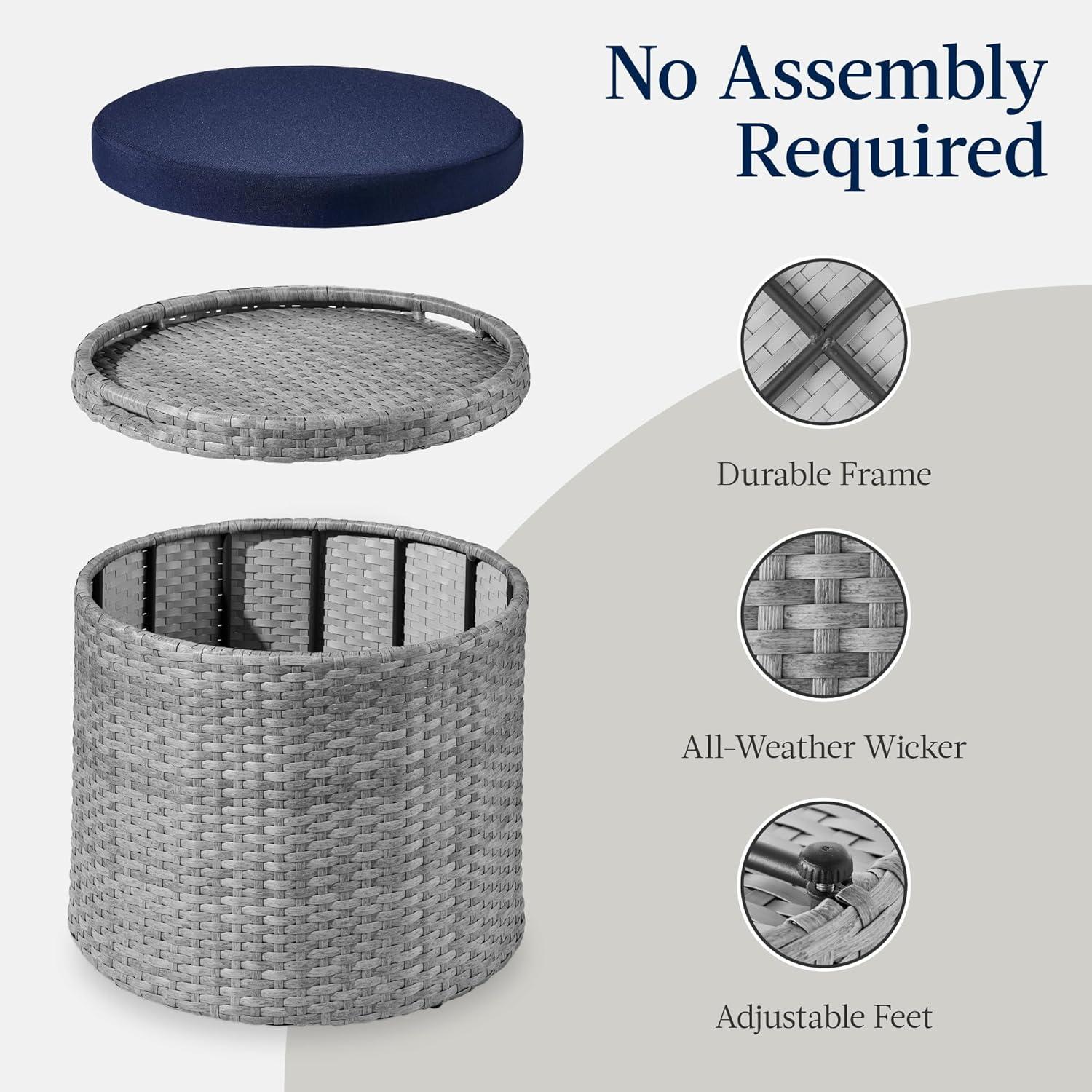 Best Choice Products Round Wicker Ottoman, Multipurpose Outdoor Furniture for Patio, Backyard, Additional Seating, Footrest, Side Table w/Storage, Removable Cushions – Brown/Beige(Gray/Navy)